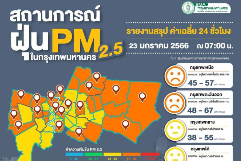 ศูนย์ข้อมูลคุณภาพอากาศกรุงเทพมหานครขอรายงานสถานการณ์ฝุ่นละอองขนาดไม่เกิน 2.5 ไมครอน (PM 2.5) ของสถานีตรวจวัดคุณภาพอากาศของกรุงเทพมหานคร ประจำวันจันทร์ที่ 23 มกราคม พ.ศ. 2566 เวลา 07.00 น. ค่าเฉลี่ย 24 ชั่วโมง ของฝุ่นละอองขนาดไม่เกิน 2.5 ไมครอน (PM2.5) ตรวจวัดได้ 34-68 ไมโครกรัม/ลูกบาศก์เมตร(มคก./ลบ.ม.) พบว่าเกินมาตรฐาน (มาตรฐานไม่เกิน 50 มคก./ลบ.ม.) จำนวน 29 พื้นที่ คือ