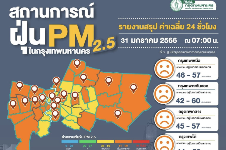 ศูนย์ข้อมูลคุณภาพอากาศกรุงเทพมหานครรายงานสถานการณ์ฝุ่นละอองขนาดไม่เกิน 2.5 ไมครอน (PM 2.5) ของสถานีตรวจวัดคุณภาพอากาศของกรุงเทพมหานคร ประจำวันอังคารที่ 31 มกราคม พ.ศ. 2566 เวลา 07.00 น. ค่าเฉลี่ย 24 ชั่วโมง ของฝุ่นละอองขนาดไม่เกิน 2.5 ไมครอน (PM2.5) ตรวจวัดได้ 40-69 ไมโครกรัม/ลูกบาศก์เมตร(มคก./ลบ.ม.) พบว่าเกินมาตรฐาน (มาตรฐานไม่เกิน 50 มคก./ลบ.ม.) จำนวน 36 พื้นที่ คือ