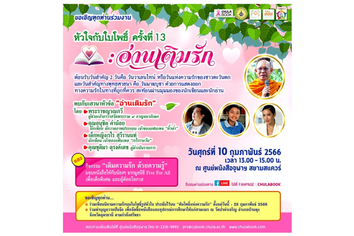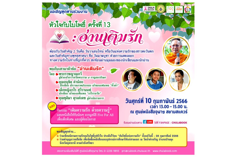 ศูนย์หนังสืจุฬาลงกรณ์มหาวิทยาลัย ร่วมกับ วัดพระราม ๙ กาญจนาภิเษก แผนงานสร้างเสริมวัฒนธรรมการอ่าน สสส. และมูลนิธิ FIVE FOR ALL จัดกิจกรรม “หัวใจกับใบโพธิ์ครั้งที่ 13 : อ่านเติมรัก” ต้อนรับวันสำคัญ 2 วันคือ วันวาเลนไทน์ หรือวันแห่งความรัก ของชาวตะวันตก และวันสำคัญทางพระพุทธศาสนา คือ วันมาฆบูชา ด้วยการแสดงออกทางความรักในทางที่ถูกที่ควร สะท้อนผ่านมุมมองของนักเขียนและนักอ่าน