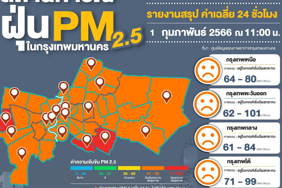 กรุงเทพมหานคร รายงานสถานการณ์ฝุ่น PM2.5 เวลา 9.00-11.00 น. (3 ชั่วโมงล่าสุด) โดยศูนย์ข้อมูลคุณภาพอากาศกรุงเทพมหานคร ผลการตรวจวัด PM2.5 สามารถตรวจวัดได้ 57-101 มคก./ลบ.ม.โดยค่าเฉลี่ยของกรุงเทพมหานคร 76.5 มคก./ลบ.ม.ค่า PM2.5 มีแนวโน้มเพิ่มขึ้น เกินมาตรฐานจำนวน 70 พื้นที่ อยู่ในระดับเริ่มมีผลกระทบต่อสุขภาพ จำนวน 67 พื้นที่ คือ