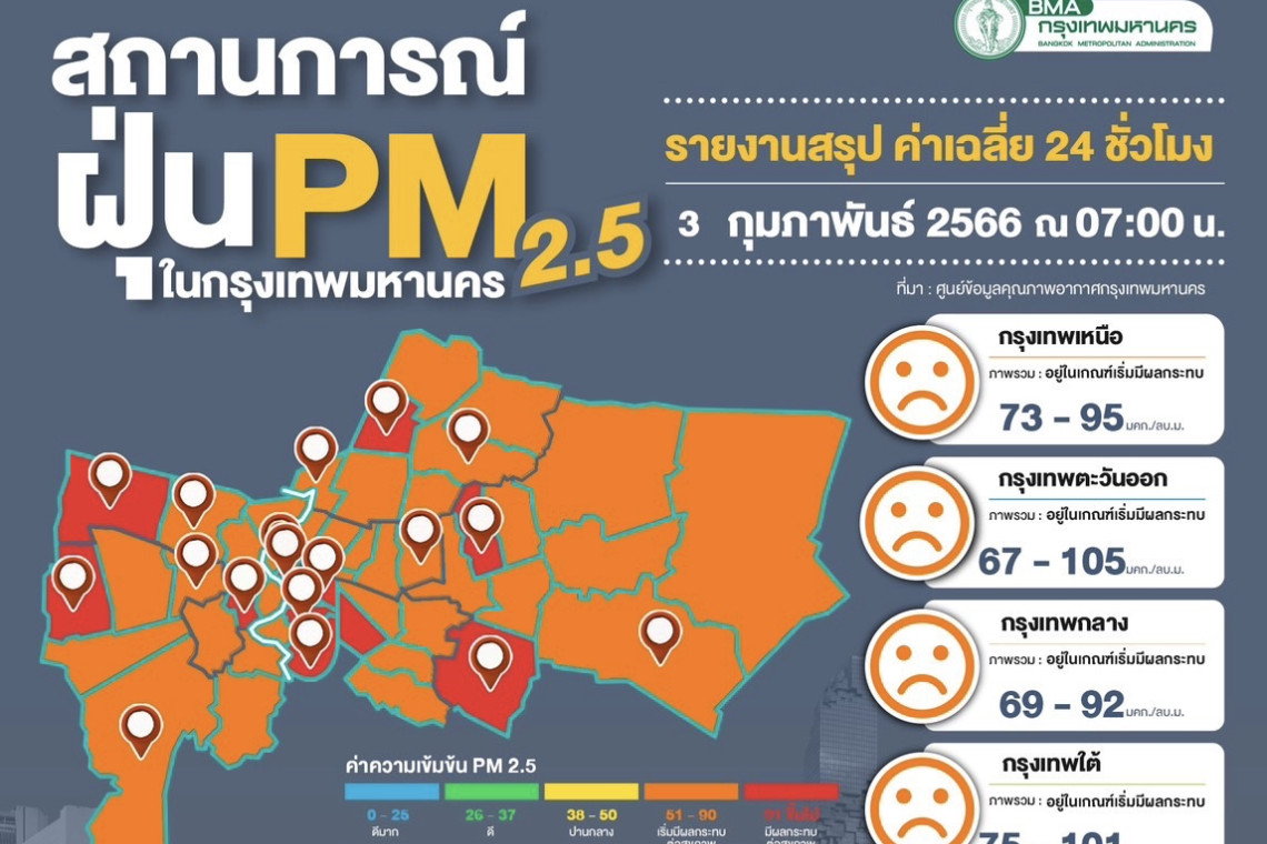 ศูนย์ข้อมูลคุณภาพอากาศกรุงเทพมหานครรายงานสถานการณ์ฝุ่นละอองขนาดไม่เกิน 2.5 ไมครอน (PM 2.5) ของสถานีตรวจวัดคุณภาพอากาศของกรุงเทพมหานคร ประจำวันศุกร์ที่ 3 กุมภาพันธ์ พ.ศ. 2566 เวลา 07.00 น. ค่าเฉลี่ย24 ชั่วโมง ของฝุ่นละอองขนาดไม่เกิน 2.5 ไมครอน (PM2.5) ตรวจวัดได้ 61-105 ไมโครกรัม/ลูกบาศก์เมตร (มคก./ลบ.ม.) พบว่าเกินมาตรฐาน (มาตรฐานไม่เกิน 50 มคก./ลบ.ม.) จำนวน 70 พื้นที่ คือ