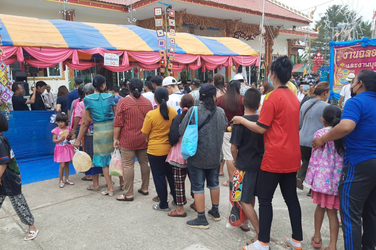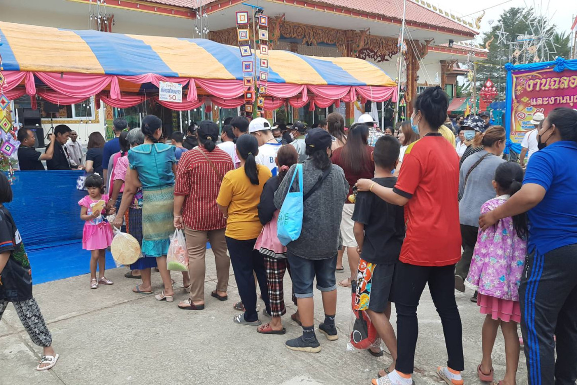 ด้าน นางอารมณ์ บ้านเป้า 62 ปี ผู้บริจาควัวเป็นรางวัลสอยดาว กล่าวว่า หลานชายตนมากราบสักการะขอพรและได้บนขอความช่วยเหลือต่อ "หลวงพ่อบุญเย็น" พระประธานในอุโบสถวัดโคกสว่าง ซึ่งเป็นพระพุทธรูปศักดิ์สิทธิ์ของชาวบ้านในพื้นที่และบริเวณพื้นที่ใกล้เคียง ว่า หากได้ไปทำงานที่ประเทศเกาหลีใต้ จะถวายวัว 1 ตัว หลังจากนั้นแค่ข้ามวันก็ได้รับการติดต่อมาให้เดินทางไปทำงานโรงงานที่ประเทศเกาหลีไต้ และได้เงินเดือนดี จึงได้ส่งเงินมาให้ตนซื้อวัว 1 ตัว เพื่อนำไปถวายหลวงพ่อบุญเย็น ซึ่งก่อนหน้านี้ลูกสาวของตนก็ได้มากราบอธิษฐานขอพรจากองค์หลวงพ่อบุญเย็น และได้เดินทางไปทำงานที่ประเทศเกาหลีใต้ เช่นกัน และได้ส่งเงินมาเพื่อทำผ้าป่าถวายหลวงพ่อฯทุก ปี