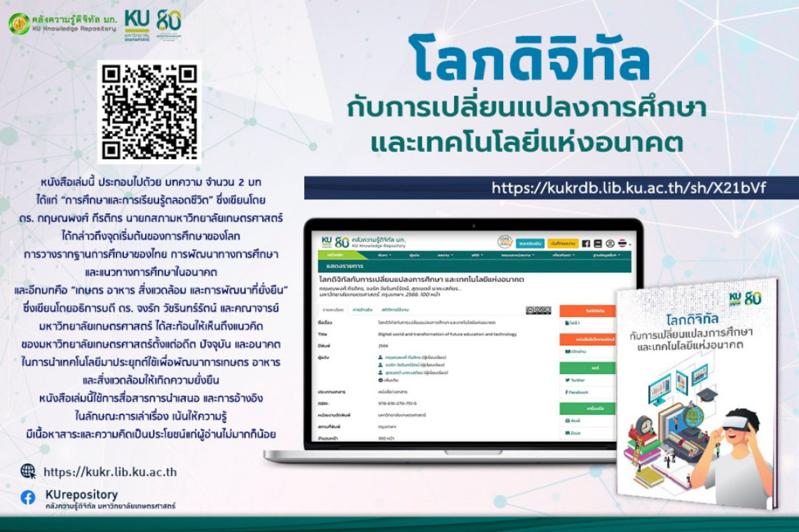 หนังสือเล่มนี้ มุ่งเน้นให้ผู้อ่านมีความรู้ความเข้าใจในสถานการณ์และสร้างการศึกษาให้สอดรับกับเทคโนโลยีดิจิทัล พร้อมที่จะขับเคลื่อนในทุกมิติให้ทุกคนได้เข้าถึงการศึกษาอย่างมีคุณภาพและเท่าเทียมกัน ไม่ว่าจะอยู่ภูมิภาคใดพื้นที่ไหนก็ตาม ไม่เพียงแต่เทคโนโลยีดิจิทัลกับการศึกษาตลอดชีวิตเท่านั้น มหาวิทยาลัยเกษตรศาสตร์ยังมีพันธกิจสําคัญในการสร้างความกินดี อยู่ดี ของคนในชาติ ดังนั้นการพัฒนาองค์ความรู้ทางด้านการเกษตรและอาหาร สู่ความยั่งยืน จึงเป็นอีกหนึ่งบทบาทหน้าที่ของมหาวิทยาลัยเกษตรศาสตร์ ที่ได้รับผิดชอบมาตลอด 80 ปี