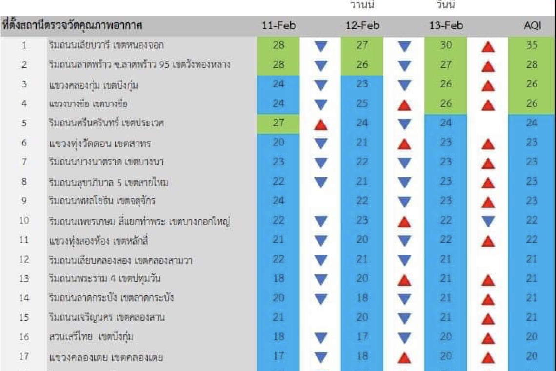 ศูนย์ข้อมูลคุณภาพอากาศกรุงเทพมหานครรายงานสถานการณ์ฝุ่นละอองขนาดไม่เกิน 2.5 ไมครอน (PM 2.5) ของสถานีตรวจวัดคุณภาพอากาศของกรุงเทพมหานคร ประจำวันจันทร์ที่ 13 กุมภาพันธ์ พ.ศ. 2566 เวลา 07.00 น. ค่าเฉลี่ย 24 ชั่วโมง ของฝุ่นละอองขนาดไม่เกิน 2.5 ไมครอน (PM2.5) ตรวจวัดได้ 10-30 ไมโครกรัม/ลูกบาศก์เมตร(มคก./ลบ.ม.) พบว่าไม่เกินมาตรฐานทุกพื้นที่ที่มีการตรวจวัด (มาตรฐานไม่เกิน 50 มคก./ลบ.ม.) ดัชนีคุณภาพอากาศของสถานีตรวจวัดของกรุงเทพมหานคร ส่วนใหญ่อยู่ในระดับคุณภาพอากาศดีมาก