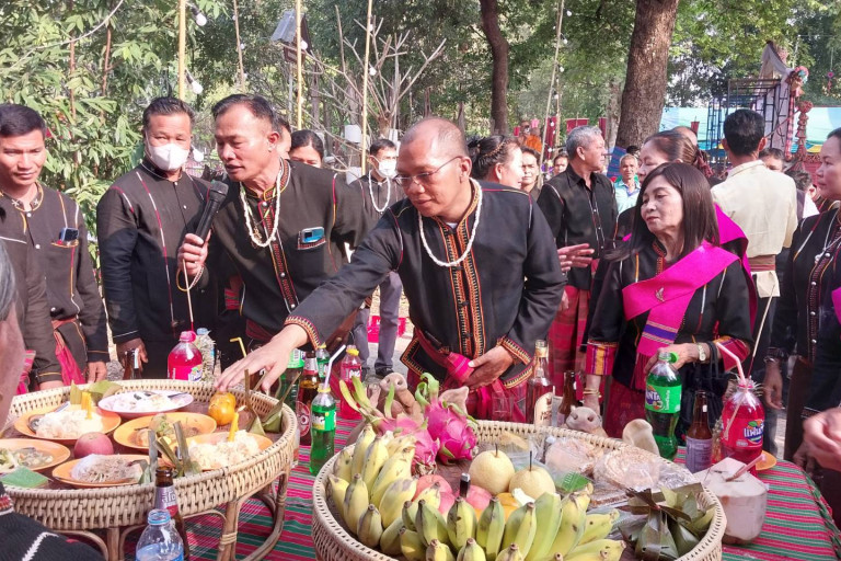 ก่อนที่จะเริ่มงานกิจกรรมนายกองโทไตรรัตน์ นายอำเภอสำโรงทาบ พร้อมด้วยนายสุรพงษ์ สุขคุ้ม นายกอบต.สำโรงทาบ นายสมบัติ วิวาสุข นายกเทสมนตรีเทศบาลตำบลสำโรงทาบ และพี่น้องในชุมชนชาวกูยที่ได้เดินทางมาร่วมงานก็ได้พากันจุดธูปเซ่นไหว้ศาลปู่เจ้าที่เจ้าทาง โดยการนำหัวหมูผลหมากรากไม้นานาชนิดไก่น้ำส้มน้ำหวานตลอดจนเหล้าเบียร์มาเซ่นไหว้ในพิธีก่อนที่จะมีการจัดงานจดทะเบียนสมรสและพิธีเรียกขวัญคู่บ่าวสาว หรือพิธี"ซัดเตกูย"พร้อมทั้งผูกข้อมือให้กับคู่บ่าวสาวที่ได้เดินทางมาร่วมงานสมรสหมู่ จำนวน 20 คู่