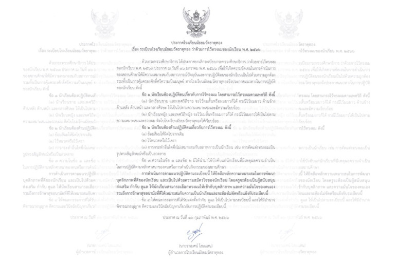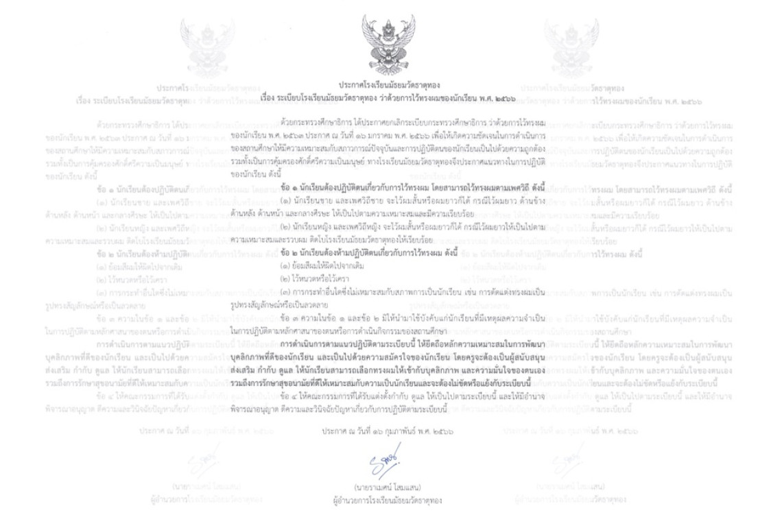 16 กุมภาพันธ์ 2566 22:26 น. สยามรัฐออนไลน์ การศึกษา วันที่ 16 ก.พ.66 เพจเฟซบุ๊ก โรงเรียนมัธยมวัดธาตุทอง-Matthayom Wat Thatthong School โพสต์ข้อความระบุว่า... ประกาศโรงเรียนมัธยมวัดธาตุทอง เรื่อง ระเบียบโรงเรียนมัธยมวัดธาตุทอง ว่าด้วยการไว้ทรงผมของนักเรียน พ.ศ.2566