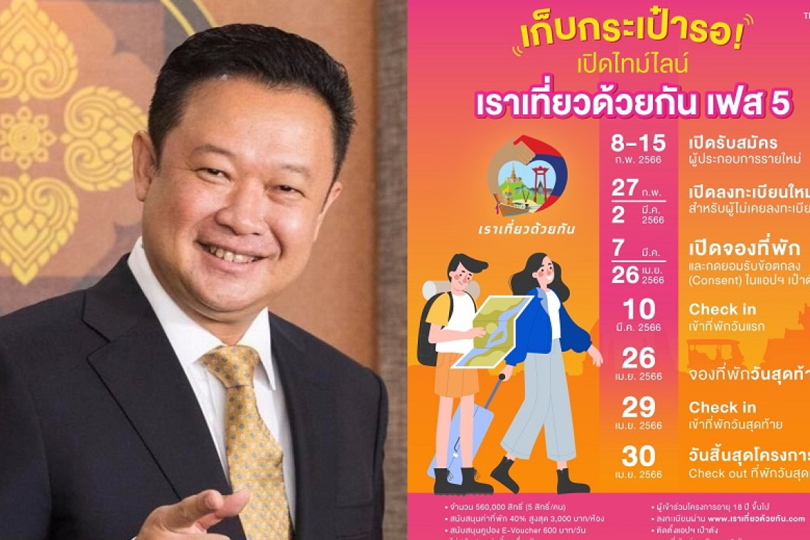 นายยุทธศักดิ์ สุภสร ผู้ว่าการ ททท. กล่าวว่า ททท. เตรียมเปิดจองใช้สิทธิ์โครงการกระตุ้นเศรษฐกิจ “เราเที่ยวด้วยกัน เฟส 5” เร็วขึ้นจากเดิม วันที่ 8 มีนาคม 2566 เป็นวันที่ 7 มีนาคม 2566 ทั้งนี้ ประชาชนที่ไม่เคยลงทะเบียนเข้าร่วมโครงการเราเที่ยวด้วยกันในเฟส 1 -4 สามารถลงทะเบียนเข้าร่วมโครงการฯ ได้ตั้งแต่วันที่ 27 กุมภาพันธ์ – 2 มีนาคม 2566 เวลา 06.00 - 21.00 น. ผ่านเว็บไซต์ www.เราเที่ยวด้วยกัน.com ขณะที่ผู้ที่เคยลงทะเบียนเข้าร่วมโครงการเราเที่ยวกัน เฟส 1 - 4 แล้ว สามารถกดยอมรับข้อตกลงและเงื่อนไขบนแอปพลิเคชั่น “เป๋าตัง” และจองใช้สิทธิ์ได้ ตั้งแต่วันที่ 7 มีนาคม 2566