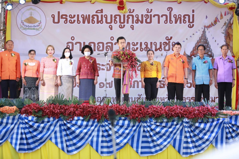 วันที่ 17 กุมภาพันธ์ 2566 เวลา 11.00 น.ผู้สื่อข่าวรายงาน ว่า ที่หน้าสนามศูนย์ราชการที่ว่าการอำเภอลำทะเมนชัย จ.นครราชสีมา นายสมเกียรติ วิริยะกุลนันท์ รองผู้ว่าราชการจังหวัดนครราชสีมา เป็นประธานในพิธีเปิดงานประเพณีบุญกุ้มข้าวใหญ่ โดยมีนายศิวเสก สินโทรัมย์ นายอำเภอลำทะเมนชัยพร้อมนายชูโชค ชะออน ประธานสภาวัฒนธรรม อ.ลำทะเมนชัย หัวหน้าส่วนราชการ ผู้นำชุมชน ประชาชนและนักเรียนร่วมให้การต้อนรับ