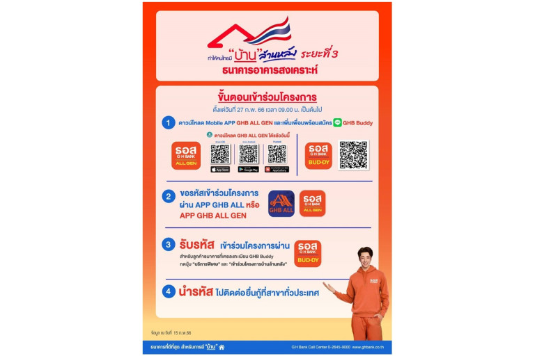 เข้าร่วมโครงการบ้านล้านหลัง ระยะที่ 3 สอบถามรายละเอียดเพิ่มเติมได้ที่ ธอส. ทุกสาขาทั่วประเทศ G H Bank Call Center โทร 0-2645-9000 หรือ Facebook Fanpage ธนาคารอาคารสงเคราะห์ และติดตามข่าวสารของธนาคารได้ที่ Mobile Application : GHB ALL, GHB ALL GEN และ www.ghbank.co.th