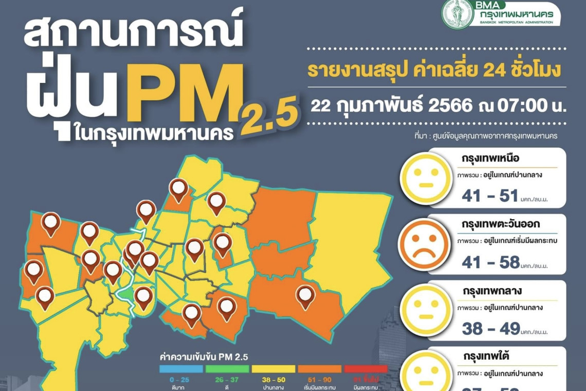 ศูนย์ข้อมูลคุณภาพอากาศกรุงเทพมหานครรายงานสถานการณ์ฝุ่นละอองขนาดไม่เกิน 2.5 ไมครอน (PM 2.5) ของสถานีตรวจวัดคุณภาพอากาศของกรุงเทพมหานคร ประจำวันพุธที่ 22 กุมภาพันธ์ พ.ศ. 2566 เวลา 07.00 น. ค่าเฉลี่ย24 ชั่วโมง ของฝุ่นละอองขนาดไม่เกิน 2.5 ไมครอน (PM2.5) ตรวจวัดได้ 32-58 ไมโครกรัม/ลูกบาศก์เมตร (มคก./ลบ.ม.) พบว่าเกินมาตรฐาน (มาตรฐานไม่เกิน 50 มคก./ลบ.ม.) จำนวน 10 พื้นที่ คือ