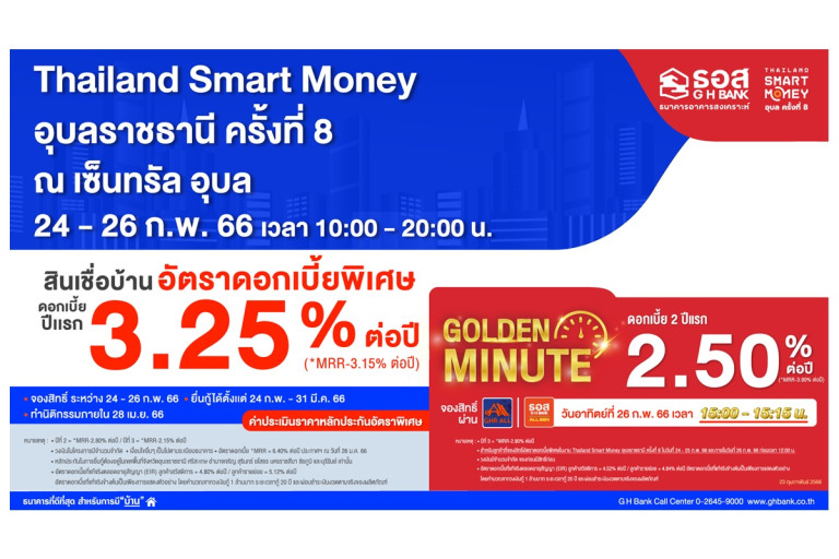ธนาคารอาคารสงเคราะห์ (ธอส.) จัดโปรโมชั่นเด็ดตะลุยแดนอีสาน ในงาน Thailand Smart Money อุบลราชธานี ครั้งที่ 8 ด้วยการนำผลิตภัณฑ์ทางการเงินของธนาคาร นำโดย สินเชื่อบ้านอัตราดอกเบี้ยต่ำ ปีที่ 1 เท่ากับ MRR-3.15% (ปัจจุบันเท่ากับ 3.25%) ต่อปี เฉลี่ย 3 ปีแรกเพียง 3.70% (อัตราดอกเบี้ย MRR ของ ธอส.ในปัจจุบันเท่ากับ 6.40% ต่อปี) ผ่อนชำระนานสูงสุดถึง 40 ปี ให้กู้ครอบคลุมทุกวัตถุประสงค์หลัก อาทิ ซื้อบ้าน/คอนโดมิเนียม
