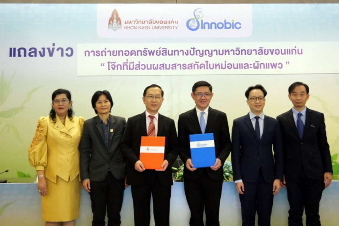 สำหรับผลงานทรัพย์สินทางปัญญา เรื่อง “โจ๊กที่มีส่วนผสมสารสกัดใบหม่อนและผักแพว” นั้น ทีมนักวิจัย นำโดย ศ.ดร.จินตนาภรณ์ วัฒนธร รักษาการแทนผู้อำนวยการสถาบันวิจัยเพื่อพัฒนาสมรรถนะมนุษย์และการเสริมสร้างสุขภาพ มหาวิทยาลัยขอนแก่น ซึ่งตั้งใจพัฒนาสูตรขึ้นมาเพื่อแก้ปัญหาสุขภาพของผู้สูงอายุซึ่งมักจะมีปัญหาเรื่องความจำและมีปัญหาเรื่องระบบกระดูก นอกจากนั้น ยังช่วยให้สามารถเพิ่มมูลค่าสินค้าเกษตรในรูปแบบผลิตภัณฑ์เพื่อสุขภาพซึ่งมีมูลค่าสูงได้ เช่นเดียวกับผู้บริหาร บริษัท อินโนบิก (เอเซีย) จำกัด ซึ่งมีวิสัยทัศน์ในการเป็นบริษัทชั้นนำด้านชีววิทยาศาสตร์ในภูมิภาคที่มีวิทยาศาสตร์อันเป็นเลิศ เพื่อยกระดับคุณภาพชีวิตประชาชน ก็มีความมุ่งมั่นขับเคลื่อนธุรกิจใหม่ทางด้าน Life Science และสอดคล้องกับวิสัยทัศน์ของมหาวิทยาลัยขอนแก่น คือ มหาวิทยาลัยวิจัยและพัฒนาชั้นนำระดับโลก (A World-Leading Research and Development University) โดยหนึ่งในเป้าหมายคือ การวิจัย พัฒนาและการนำไปใช้ประโยชน์ จึงทำให้เกิดความร่วมมือและนำไปสู่การ Matching ผลงานวิจัยและธุรกิจในครั้งนี้