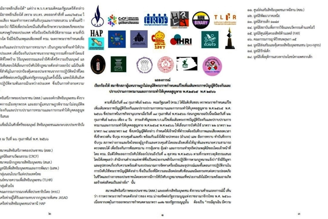 เรียกร้องให้ สมาชิกสภาผู้แทนราษฎรไม่อนุมัติพระราชกำหนดแก้ไขเพิ่มเติมพระราชบัญญัติป้องกันและปราบปรามการทรมานและการกระทำให้บุคคลสูญหาย พ.ศ.2565 พ.ศ.2566