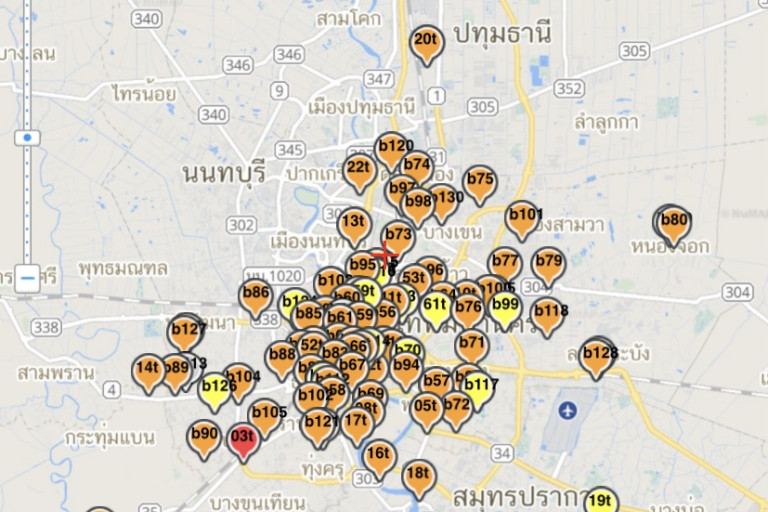 แขวงหิรัญรูจี เขตธนบุรี จ.กรุงเทพฯ, ริมถนนกาญจนาภิเษก เขตบางขุนเทียน จ.กรุงเทพฯ, แขวงบางนา เขตบางนาจ.กรุงเทพฯ, ต.ทรงคนอง อ.พระประแดง จ.สมุทรปราการ, แขวงคลองจั่น เขตบางกะปิ จ.กรุงเทพฯ, แขวงดินแดง เขตดินแดง จ.กรุงเทพฯ, แขวงช่องนนทรี เขตยานนาวา จ.กรุงเทพฯ, ต.ตลาดขวัญ อ.เมือง จ.นนทบุรี, ต.อ้อมน้อยอ.กระทุ่มแบน จ.สมุทรสาคร, ต.บางโปรง อ.เมือง จ.สมุทรปราการ, ต.ตลาด อ.พระประแดง จ.สมุทรปราการ, ต.ปากน้ำ อ.เมือง จ.สมุทรปราการ, ต.คลองหนึ่ง อ.คลองหลวง จ.ปทุมธานี, ต.บางพูด อ.ปากเกร็ด จ.นนทบุรี, ต.มหาชัย อ.เมือง จ.สมุทรสาคร, ริมถนนพระราม 4 เขตปทุมวัน จ.กรุงเทพฯ, ริมถนนอินทรพิทักษ์ เขตธนบุรีจ.กรุงเทพฯ, ริมถนนลาดพร้าว เขตวังทองหลาง จ.กรุงเทพฯ, ริมถนนดินแดง เขตดินแดง จ.กรุงเทพฯ, ต.นครปฐมอ.เมือง จ.นครปฐม, แขวงคลองกุ่ม เขตบึงกุ่ม, เขตคลองสามวา จ.กรุงเทพฯ, เขตจอมทอง จ.กรุงเทพฯ, ริมถนนจรัญสนิทวงศ์ เขตบางพลัด จ.กรุงเทพฯ, เขตบางแค จ.กรุงเทพฯ, ริมถนนพระราม 2 เขตบางขุนเทียน จ.กรุงเทพฯ, เขตบางคอแหลม จ.กรุงเทพฯ, สวนวชิรเบญจทัศ เขตจตุจักร, สวน 60 พรรษาสมเด็จพระนางเจ้าพระบรมราชินีนาถเขตลาดกระบัง, อุทยานเบญจสิริ เขตคลองเตย, สวนรมณีย์ทุ่งสีกัน เขตดอนเมือง, สวนธนบุรีรมย์ เขตทุ่งครุ, สวนสมเด็จพระนางเจ้าสิริกิติ์ฯ เขตจตุจักร, สวนเสรีไทย เขตบึงกุ่ม, สวนทวีวนารมย์ เขตทวีวัฒนา, สวนพระนคร เขตลาดกระบัง, สวนหนองจอก เขตหนองจอก, สวนกีฬารามอินทรา เขตบางเขน, ริมถนนวิภาวดีรังสิต จ.เขตดินแดงจ.กรุงเทพฯ, ริมถนนสุขุมวิท เขตพระโขนง จ.กรุงเทพฯ, ริมถนนราษฎร์บูรณะ จ.เขตราษฎร์บูรณะ จ.กรุงเทพฯ, ริมถนนพญาไท เขตราชเทวี จ.กรุงเทพฯ, ริมถนนพระราม 5 เขตดุสิต จ.กรุงเทพฯ, ริมถนนกรุงเกษม เขตป้อมปราบศัตรูพ่ายจ.กรุงเทพฯ, ริมถนนตรีมิตร วงเวียนโอเดียน์ เขตสัมพันธวงศ์ จ.กรุงเทพฯ, ริมถนนพระราม 6 เขตพญาไทจ.กรุงเทพฯ, ริมถนนลาดพร้าว ซอยลาดพร้าว 95 เขตวังทองหลาง จ.กรุงเทพฯ, ริมถนนพระรามที่ 4 หน้าสามย่านมิตรทาวน์ เขตปทุมวัน จ.กรุงเทพฯ, ริมถนนนราธิวาส เขตบางรัก จ.กรุงเทพฯ, แขวงทุ่งวัดดอน เขตสาทร จ.กรุงเทพฯ, ริมถนนพระราม 3 เขตยานนาวา จ.กรุงเทพฯ, ริมถนนพัฒนาการ เขตสวนหลวง จ.กรุงเทพฯ, ริมถนนบางนา-ตราดเขตบางนา จ.กรุงเทพฯ, ริมถนนพหลโยธิน แยก ม.เกษตรศาสตร์ เขตจตุจักร จ.กรุงเทพฯ, เขตดอนเมือง จ.กรุงเทพฯ, ริมถนนสุขาภิบาล5 เขตสายไหม จ.กรุงเทพฯ, ริมถนนนวมินทร์ แยกบางกะปิ เขตบางกะปิ จ.กรุงเทพฯ, แยกสวนสยาม-รามอินทรา เขตคันนายาว จ.กรุงเทพฯ, ริมถนนลาดกระบัง เขตลาดกระบัง จ.กรุงเทพฯ, ริมถนนสีหบุรานุกิจ เขตมีนบุรี จ.กรุงเทพฯ, ริมถนนเลียบวารี เขตหนองจอก จ.กรุงเทพฯ, ริม