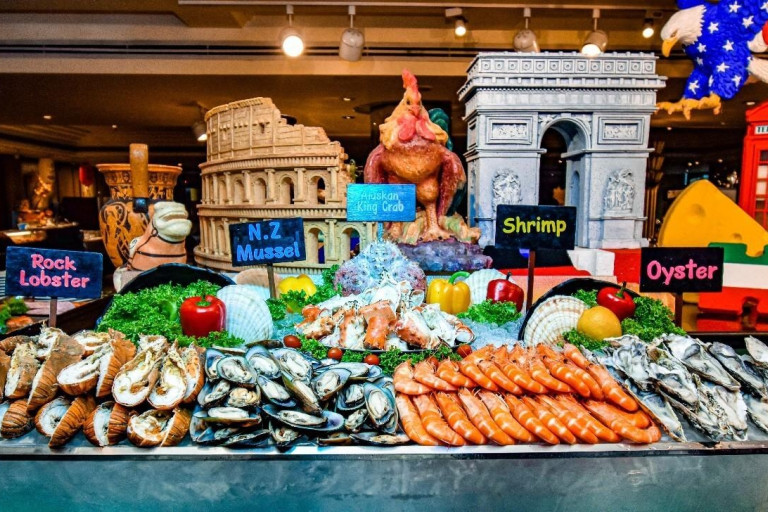 โดยไฮไลท์ที่นำเสนอจะเป็น บุฟเฟต์นานาชาติที่รวมซีฟู้ดและซูชิพรีเมียมมื้อเย็น บริการระหว่างเวลา 18.00 – 22.00 น. ด้วยหอยนางรม กั้งกระดาน หอยหวาน กุ้งแม่น้ำ หอยแมลงภู่นิวซีแลนด์ ฯลฯ พร้อมน้ำจิ้มสูตรเด็ดซี๊ดซ้าด รสแซบ มุมข้าวต้มกุ๊ย บริการทั้งข้าวต้มแดง ข้าวต้มขาว ข้าวต้มเผือก และเครื่องเคียงกับข้าวมากมายให้เลือกอิ่มอร่อย ส่วน มุม Carving Station มีทั้ง สเต็กเนื้อวากิว ซี่โครงหมูบาร์บีคิว พอร์คช็อพซอสทรัฟเฟิล ปลาแซลมอนอบซอสไวน์ขาว ฯลฯ