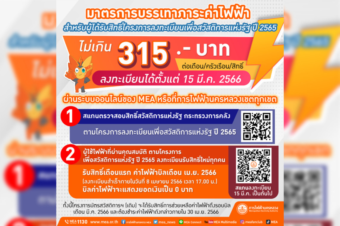 MEA แจ้งมาตรการบรรเทาภาระค่าไฟฟ้า ไม่เกิน 315 บาท ต่อเดือน/ครัวเรือน/สิทธิ์ สำหรับผู้ได้รับสิทธิ์โครงการลงทะเบียนเพื่อสวัสดิการแห่งรัฐ ปี 2565