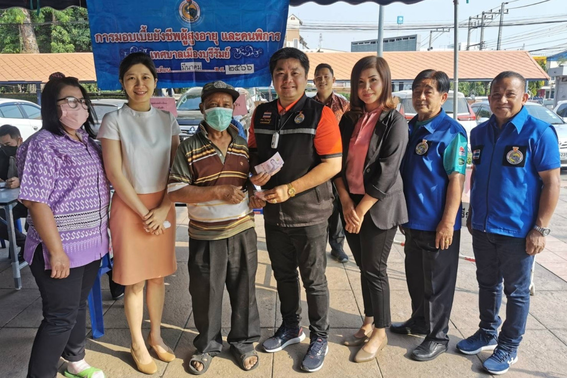 วันนี้ (10 มี.ค.66) นายสกล ไกรรณภูมิ นายกเทศมนตรีเมืองบุรีรัมย์ พร้อมด้วย นายสมศักดิ์ ธีระวิวัฒนกิจ รองนายกเทศมนตรีเมืองบุรีรัมย์ นายสมเกียรติ พลรัมย์ เลขานุการนายกเทศมนตรีเมืองบุรีรัมย์ นางสาวภรภัทร สงวนสิน ผู้อำนวยการกองสวัสดิการสังคม เทศบาลเมืองบุรีรัมย์ และเจ้าหน้าที่กองสวัสดิการสังคม เทศบาลเมือง (ทม.) บุรีรัมย์ มอบเบี้ยยังชีพประจำเดือน มีนาคม 2566 ให้กับผู้สูงอายุ และคนพิการ ในเขตเทศบาลเมืองบุรีรัมย์ ทั้ง 18 ชุมชน จำนวน 251 คน แยกเป็นผู้สูงอายุ 209 คน ผู้พิการ 42 คน เพื่อช่วยเหลือบรรเทาความเดือดร้อน ให้กลุ่มคนเหล่านี้สามารถใช้ชีวิตอยู่ร่วมกับสังคมได้อย่างมีความสุข ที่เต็นท์ หน้าสำนักงานเทศบาลเมืองบุรีรัมย์