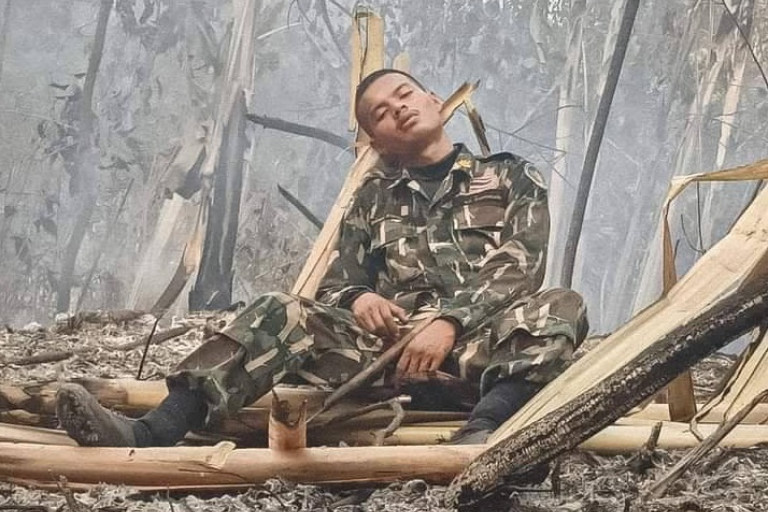 ร่วมส่งกำลังใจให้เจ้าหน้าที่และทุกหน่วยงานที่กำลังปฏิบัติภารกิจดับไฟป่าให้ปฏิบัติภารกิจสำเร็จด้วยความปลอดภัย" พร้อมภาพประกอบเป็นภาพเจ้าหน้าที่ที่สวมชุดทำงานนั่งหลับอยู่ท่ามกลางป่าที่ถูกไฟไหม้หมดแล้ว “ซึ่งมีผู้มาพบเห็นในเพจก็ต่างให้กำลังใจกับเจ้าหน้าที่ดับไฟป่าครั้งนี้