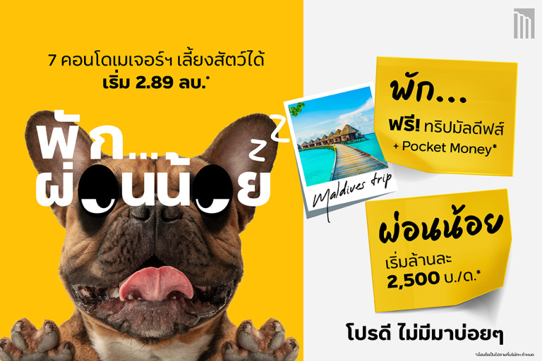 “เมเจอร์ ดีเวลลอปเม้นท์” ผู้พัฒนาอสังหาริมทรัพย์ระดับลักซูรีและคอนโดมิเนียมเลี้ยงสัตว์ได้(Pet-Friendly Residences) ยกทัพ 7 คอนโดเลี้ยงสัตว์ได้ทั้งโครงการพร้อมอยู่และโครงการใหม่ หลากแบรนด์ดัง มาเอสโตร เมทริส และเอ็ม บนหลากทำเลศักยภาพ จัดแคมเปญสุดยิ่งใหญ่แห่งปี ภายใต้ชื่อ “พัก...ผ่อนน้อย” เพียงซื้อโครงการที่เข้าร่วมแคมเปญ มอบสิทธิ์ให้คุณได้ “พัก” ไปกับ ทริปมัลดีฟส์* รวมมูลค่ากว่า 100,000 บาท ฟรีทันทีทุกยูนิต สำหรับผู้ที่ซื้อห้องชุดแบบ 2 ห้องนอน รับเพิ่ม Pocket Money ติดกระเป๋าอีกจำนวน 50,000 บาท