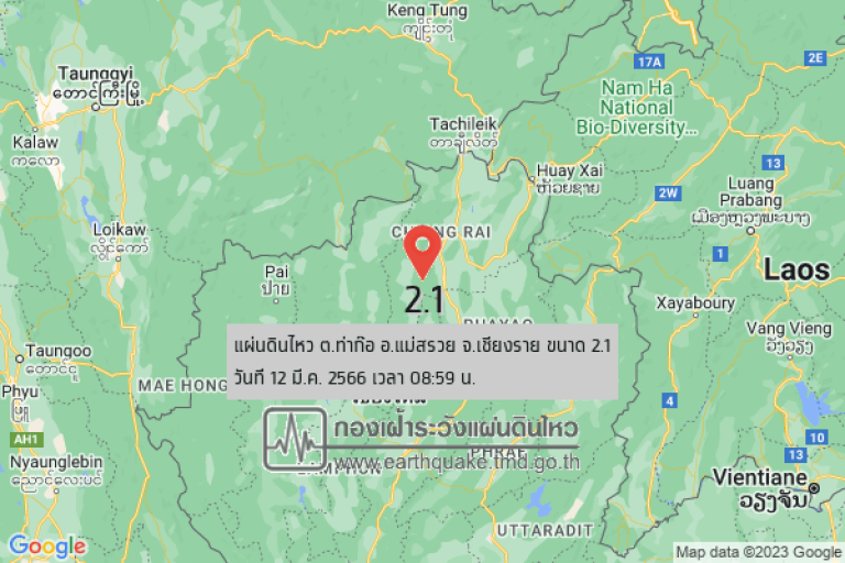 เมื่อวันที่ 12 มี.ค.66 กองเฝ้าระวังแผ่นดินไหว แจ้งพบเหตุแผ่นดินไหว ในพื้นที่ ต.ท่าก๊อ อ.แม่สรวย จ.เชียงราย ขนาด 2.1 แม็กนิจูด ความลึก 2 กิโลเมตร เมื่อเวลา 08.59 น. ตามเวลาในประเทศไทย ทั้งนี้ทางเจ้าหน้าที่ยังไม่พบความเสียหายในขณะนี้ โดยก่อนหน้านี้เมื่อวันที่ 11 มี.ค. ได้พบแผ่นดินไหว ขนาด 1.6 แม็กนิจูด ที่ต.สันพร้าว อ.พร้าว จ.เชียงใหม่ เหตุเกิดเมื่อเวลา 00.31 น.ตามเวลาในประเทศไทย