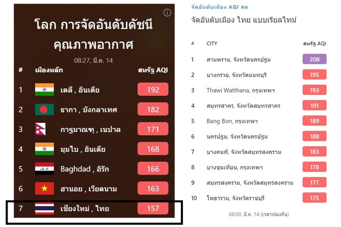 ขณะที่คุณภาพอากาศทั่วโลก พบว่า เดลี ประเทศอินเดีย แย่สุด ส่วนประเทศไทย พบเชียงใหม่ และกรุงเทพมหานคร ติดอันดับ 7 และ 12 เมืองคุณภาพอากาศแย่ของโลก