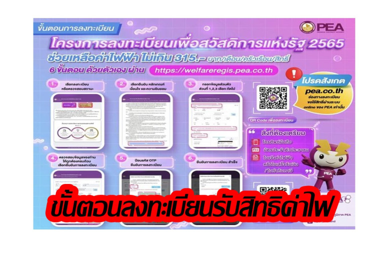 ตามที่คณะรัฐมนตรีมีมติเห็นชอบกรอบระยะเวลาการดำเนินโครงการลงทะเบียนเพื่อสวัสดิการแห่งรัฐ เพื่อบรรเทาภาระค่าไฟฟ้าสำหรับผู้มีสิทธิ์สวัสดิการแห่งรัฐและผ่านการยืนยันตัวตน (e-KYC) เรียบร้อย ผู้ที่ได้รับสิทธิ์จะต้องลงทะเบียนใหม่ทุกรายเพื่อขอรับสิทธิ์สนับสนุนค่าไฟฟ้าไม่เกิน 315 บาท/เดือน/ครัวเรือน/สิทธิ์ กับการไฟฟ้าส่วนภูมิภาค (PEA) ตั้งแต่วันที่ 15 มีนาคม 2566 เวลา 08.00 น. เป็นต้นไป โดยขั้นตอนการลงทะเบียนผ่าน https://welfareregis.pea.co.th ดังนี้