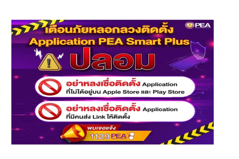 การไฟฟ้าส่วนภูมิภาค (PEA) พบว่ามีการหลอกลวงให้ติดตั้ง Application PEA Smart Plus ดังนั้น จึงขอเตือนประชาชนไม่ควรหลงเชื่อติดตั้ง Application จากผู้ที่ส่ง Link มายังท่าน หรือจากเว็บไซต์อื่นที่ไม่ใช่เว็บไซต์ของการไฟฟ้าส่วนภูมิภาค (www.pea.co.th)