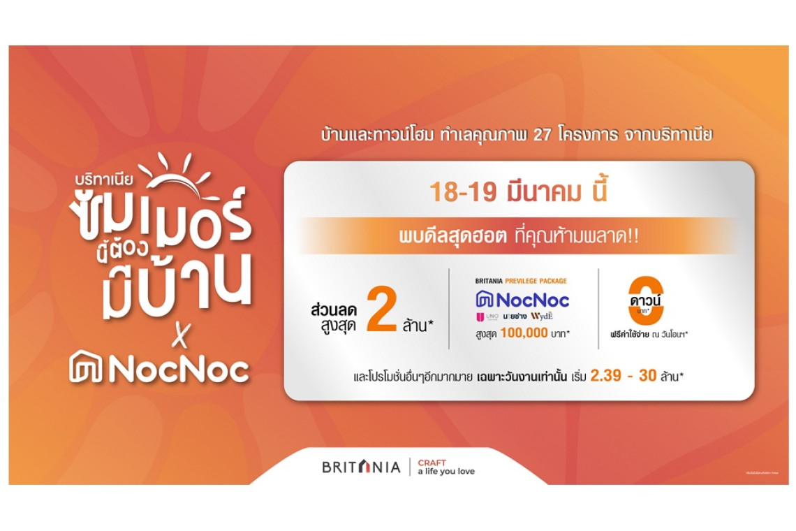 บริทาเนีย ผู้พัฒนาบ้านจัดสรรภายใต้คอนเซปต์ CRAFT a life you love ดีที่สุดคือใช้ชีวิตในแบบที่รัก ยกทัพ 27 โครงการบ้านคุณภาพ หลากทำเลศักยภาพ จาก 4 แบรนด์ดัง ไบรตัน, บริทาเนีย, แกรนด์ บริทาเนีย และเบลกราเวีย ร่วมดีลฮอตแห่งปีกับแคมเปญ “ซัมเมอร์นี้ ต้องมีบ้าน” มอบส่วนลดสูงสุดถึง 2 ล้านบาท* พร้อม Gift Voucher เพื่อคนรักการแต่งบ้านจาก NocNoc มูลค่าสูงสุด 100,000 บาท* ดาวน์ 0 บาท* ฟรี! ทุกค่าใช้จ่ายวันโอน* พิเศษเฉพาะผู้ที่โอนกรรมสิทธิ์ภายใน 31 มีนาคมนี้เท่านั้น ราคาเริ่มต้นเพียง 2.39 ล้านบาท ผู้สนใจสามารถเข้าชมโครงการที่สนใจได้ที่สำนักงานขายโครงการที่เข้าร่วมแคมเปญ ใน วันที่ 18-19 มี.ค.นี้เท่านั้น หรือดูรายละเอียดเพิ่มเติมได้ที่ https://briurl.com/2p8ms79u โทร 02 161 3000 *เงื่อนไขเป็นไปตามที่บริษัทฯกำหนด