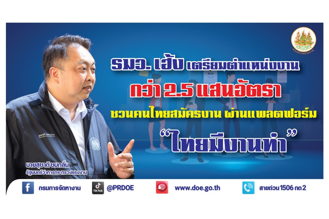 กระทรวงแรงงาน ชวนคนหางานใช้บริการเว็บไซต์ “ไทยมีงานทำ.doe.go.th” และแอปฯ “ไทยมีงานทำ” ให้บริการฟรี! ไม่มีค่าใช้จ่าย รวมตำแหน่งงานภาครัฐ เอกชน และตำแหน่งงานจากบริษัทจัดหางานเพื่อผู้หางานกว่า 2 แสน 5 หมื่นอัตรา