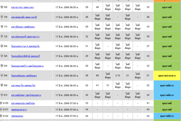 วันที่ 17 มีนาคม 2566 ระหว่างเวลา 05.00-07.00 น. กองจัดการคุณภาพอากาศและเสียง กรมควบคุมมลพิษรายงานสถานการณ์คุณภาพอากาศ พื้นที่กรุงเทพฯและปริมณฑล พบว่า คุณภาพอากาศอยู่ในระดับ คุณภาพดีมากถึงเริ่มมีผลกระทบต่อสุขภาพ สารมลพิษทางอากาศที่ตรวจพบเกินมาตรฐานได้แก่ ฝุ่นละออง ขนาดไม่เกิน 2.5 ไมครอน(PM2.5) ตรวจพบค่าระหว่าง 21 - 56 ไมโครกรัมต่อลูกบาศก์เมตร (µg/m3) เกินมาตรฐาน 1 พื้นที่ คือ