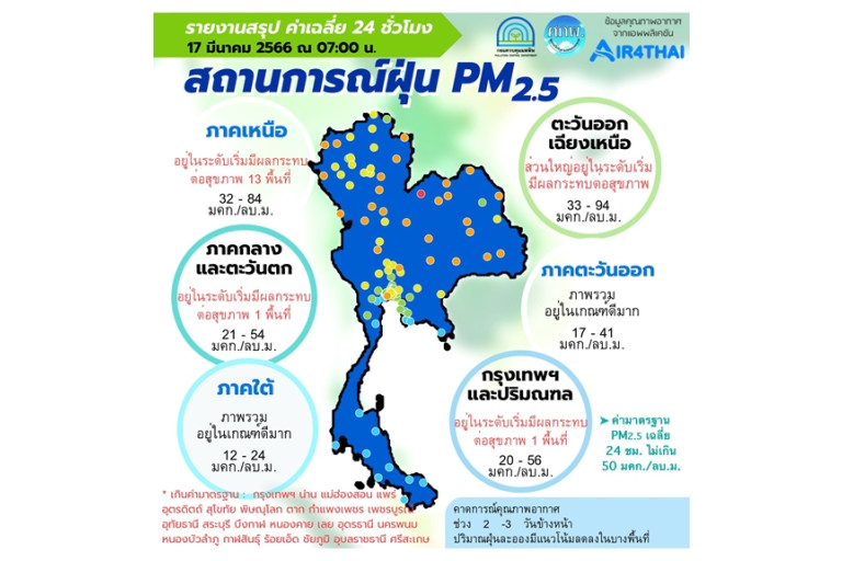 ศูนย์แก้ไขปัญหามลพิษทางอากาศ รายงานการติดตามตรวจสอบคุณภาพอากาศ ประจำวันที่ 17 มีนาคม 2566 ณ 07:00 น สรุปดังนี้ ภาพรวมปริมาณ PM2.5 ในประเทศพบเกินค่ามาตรฐานในกรุงเทพฯ จ.น่าน จ.แม่ฮ่องสอน จ.แพร่ จ.อุตรดิตถ์ จ.สุโขทัย จ.พิษณุโลก จ.ตาก จ.กำแพงเพชร จ.เพชรบูรณ์ จ.อุทัยธานี จ.สระบุรี จ.บึงกาฬ จ.หนองคาย จ.เลย จ.อุดรธานี จ.นครพนม จ.หนองบัวลำภู จ.กาฬสินธุ์ จ.ร้อยเอ็ด จ.ชัยภูมิ จ.อุบลราชธานี จ.ศรีสะเกษ จ.นครราชสีมา และ จ. บุรีรัมย์