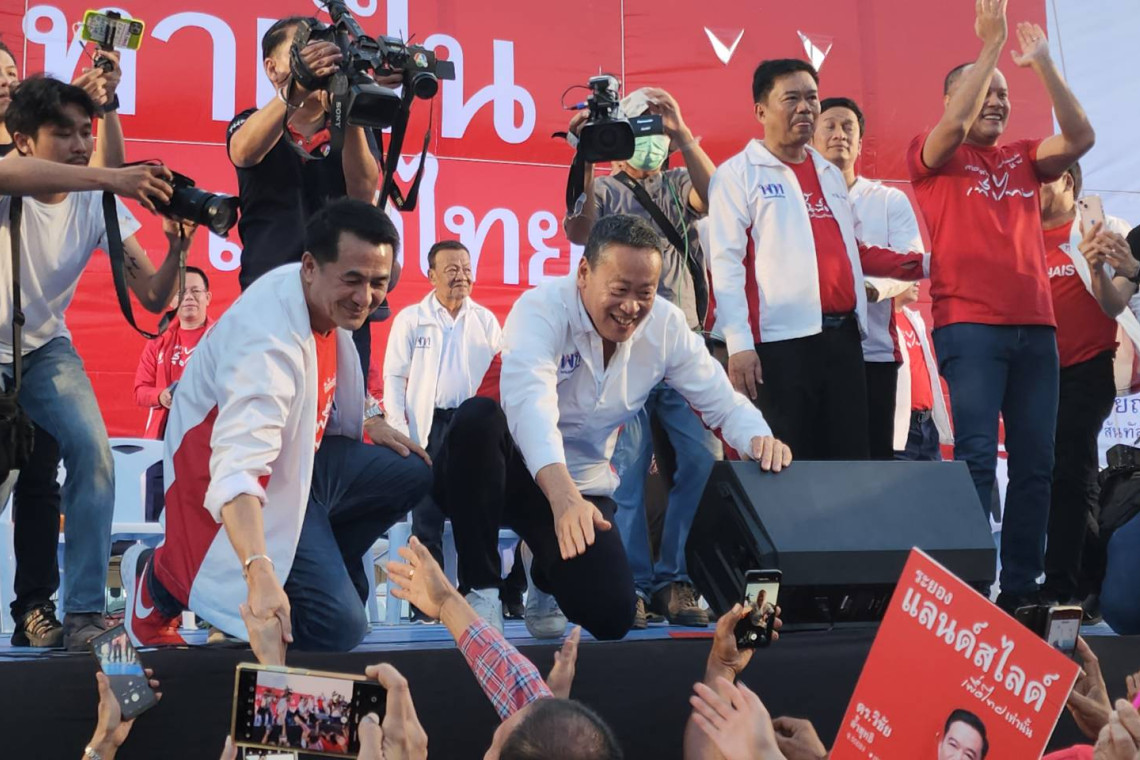 วันที่ 19 มี.ค.66 เวลา 18.00 น.ผู้สื่อข่าวรายงาน ว่า ที่บริเวณลานโครงการหมู่บ้านเพลินใจ 5 ข้างสถานีขนส่งผู้โดยสารแห่งใหม่ระยอง ต.ทับมา อ.เมือง จ.ระยอง ผู้สื่อข่าวรายงานว่า พรรคเพื่อไทยได้จัดเวทีปราศรัยใหญ่ช่วยว่าที่ผู้สมัคร ส.ส.ระยอง พรรคเพื่อไทยทั้ง 5 เขต ประกอบด้วย เขต 1 นายพเนตร วงศ์ไพศาล เขต 2 นายภีมเดช อมรสุคนธ์ เขต 3 นายชัยณรงค์ สันทัสนะโชติ เขต 4 นายวิเชียร สุขเกิดและเขต 5 นายวิชัย ล้ำสุทธิ นำโดย นพ.ชลน่าน ศรีแก้ว หัวหน้าพรรค นายเศรษฐา ทวีสิน ประธานที่ปรึกษาหัวหน้าครอบครัวเพื่อไทย นายอดิศร เพียงเกษ โฆษกผู้นำฝ่ายค้านในสภาผู้แทนราษฎร นายณัฐวุฒิ ใสยเกื้อ ผู้อำนวยการครอบครัวเพื่อไทย และนพ.พรหมินทร์ เลิศสุริย์เดช ประธานคณะกรรมการด้านเศรษฐกิจพรรค โดยมีประชาชนชาวจังหวัดระยอง นับหมื่นคนเดินทางมารับฟังการปราศัย