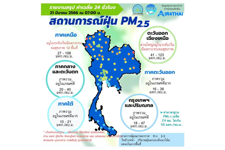 ศูนย์แก้ไขปัญหามลพิษทางอากาศ รายงานการติดตามตรวจสอบคุณภาพอากาศ ประจำวันที่ 21 มีนาคม 2566 ณ 07:00 น สรุปดังนี้ ภาพรวมปริมาณ PM2.5 ในประเทศพบเกินค่ามาตรฐานใน จ.เชียงราย จ.เชียงใหม่ จ.แม่ฮ่องสอน จ.น่าน จ.แพร่ จ.สุโขทัย จ.พิษณุโลก จ.หนองคาย จ.เลย จ.นครพนม จ.หนองบัวลำภู จ.สกลนคร จ.มุกดาหาร จ.กาฬสินธุ์ และ จ. อุบลราชธานี