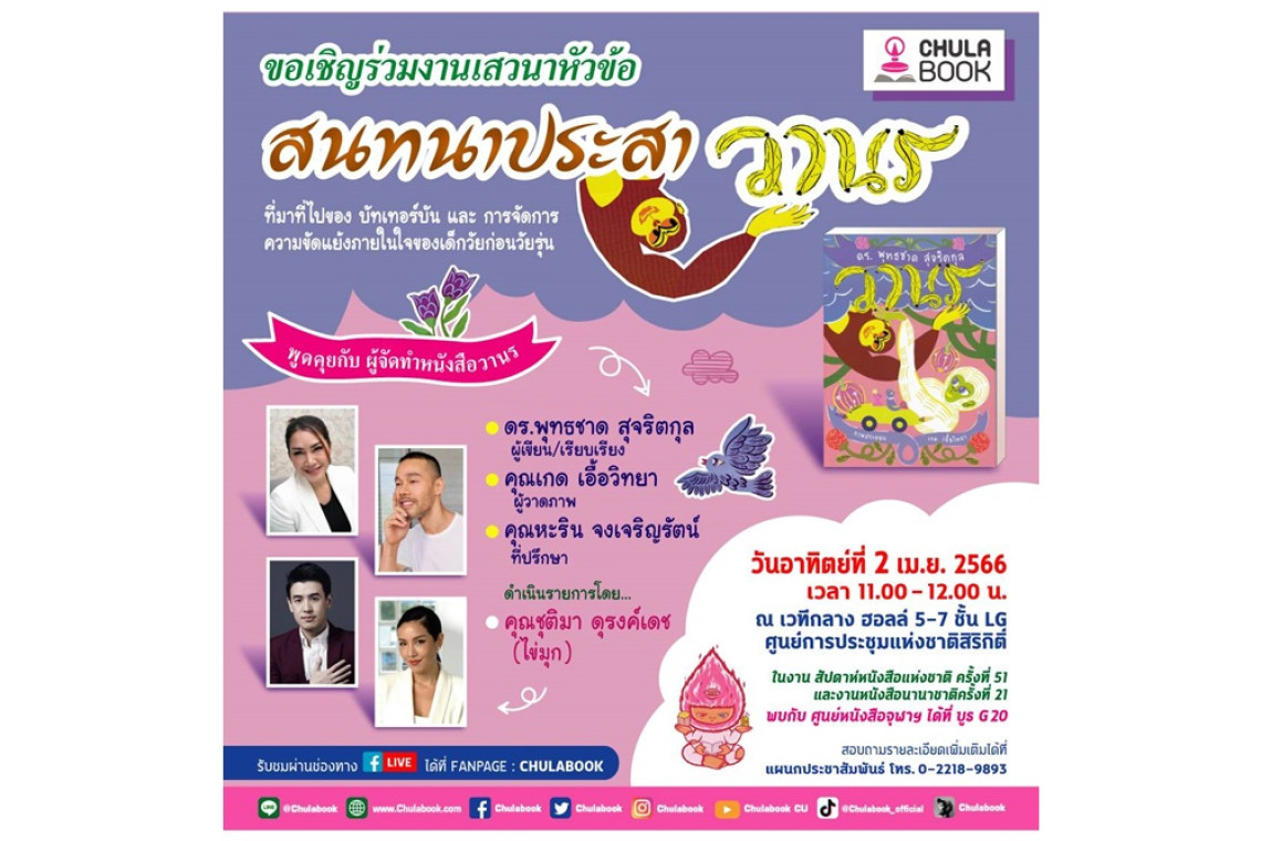 ในวันอาทิตย์ที่ 2 เมษายน 2566 เวลา 11.00 - 12.00 น. ณ เวทีกลาง ฮอลล์ 5 – 7 ชั้น LG ศูนย์การประชุมแห่งชาติสิริกิติ์ ในสัปดาห์หนังสือแห่งชาติครั้งที่ 51 และงานสัปดาห์หนังสือนานาชาติ ครั้งที่ 21 รับชมผ่าน Facebook live ได้ที่ Fanpage : CHULABOOK และพบกับศูนย์หนังสือจุฬาฯ ได้ที่ บูธ G 20 สอบถามรายละเอียดเพิ่มเติมที่ แผนกประชาสัมพันธ์ ศูนย์หนังสือจุฬาฯ โทร. 0-2218-9893
