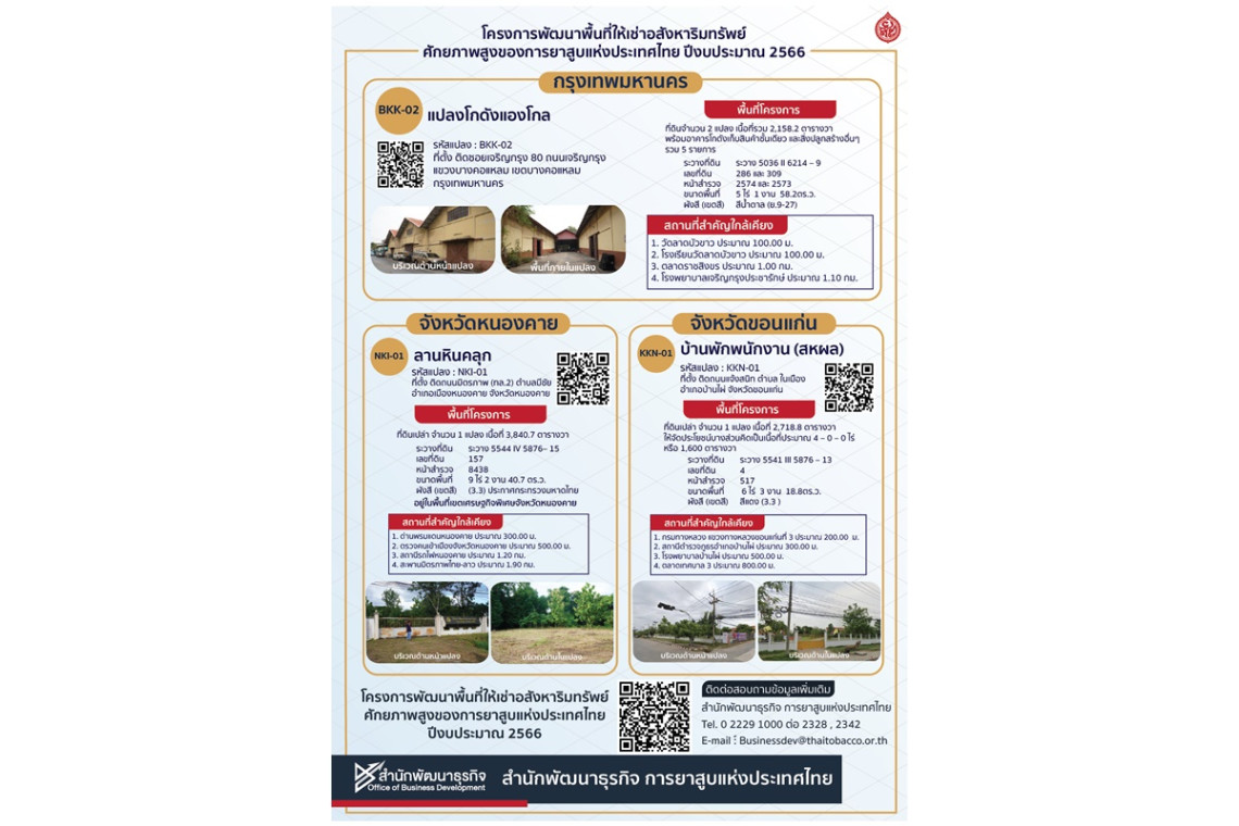 การยาสูบแห่งประเทศไทย (ยสท.)เปิดประมูลให้เช่าที่ดินทำเลดีระยะยาว 30 ปี จำนวน 3 แปลง ได้แก่ “แปลงโกดังแองโกล” โฉนดเลขที่ 6009 และ 23614 เนื้อที่ 5-1-58.2 ไร่ ตั้งอยู่ในซอยเจริญกรุง 80 กรุงเทพมหานคร ภายในพื้นที่มีอาคารคลังสินค้า 2 หลัง พื้นที่อาคาร 6,140 ตารางเมตร ที่ตั้งโครงการใกล้กับเอเชียทีค เดอะริเวอร์ฟรอนต์ และย่านธุรกิจถนนสาทร สีลม ส่วนอีก 2 แปลง อยู่ในภาคตะวันออกเฉียงเหนือ ได้แก่ “แปลงบ้านพัก (สหผล) ขอนแก่น” โฉนดเลขที่ 332 เนื้อที่ 6-3-18.8 ไร่ ริมถนนแจ้งสนิท อำเภอบ้านไผ่ ขอนแก่น อยู่ในย่านชุมชนตลาดบ้านไผ่ และ “แปลงลานหินคลุก หนองคาย” โฉนดเลขที่ 102741 เนื้อที่ 9-2-40.7 ไร่ ตั้งอยู่ติดถนนมิตรภาพ (ทล.2) ห่างจากด่านพรมแดนไทย-ลาว เพียง 300 เมตร (ฝั่งขาเข้า) ทำเลย่านขนส่ง การท่องเที่ยว การค้าชายแดน
