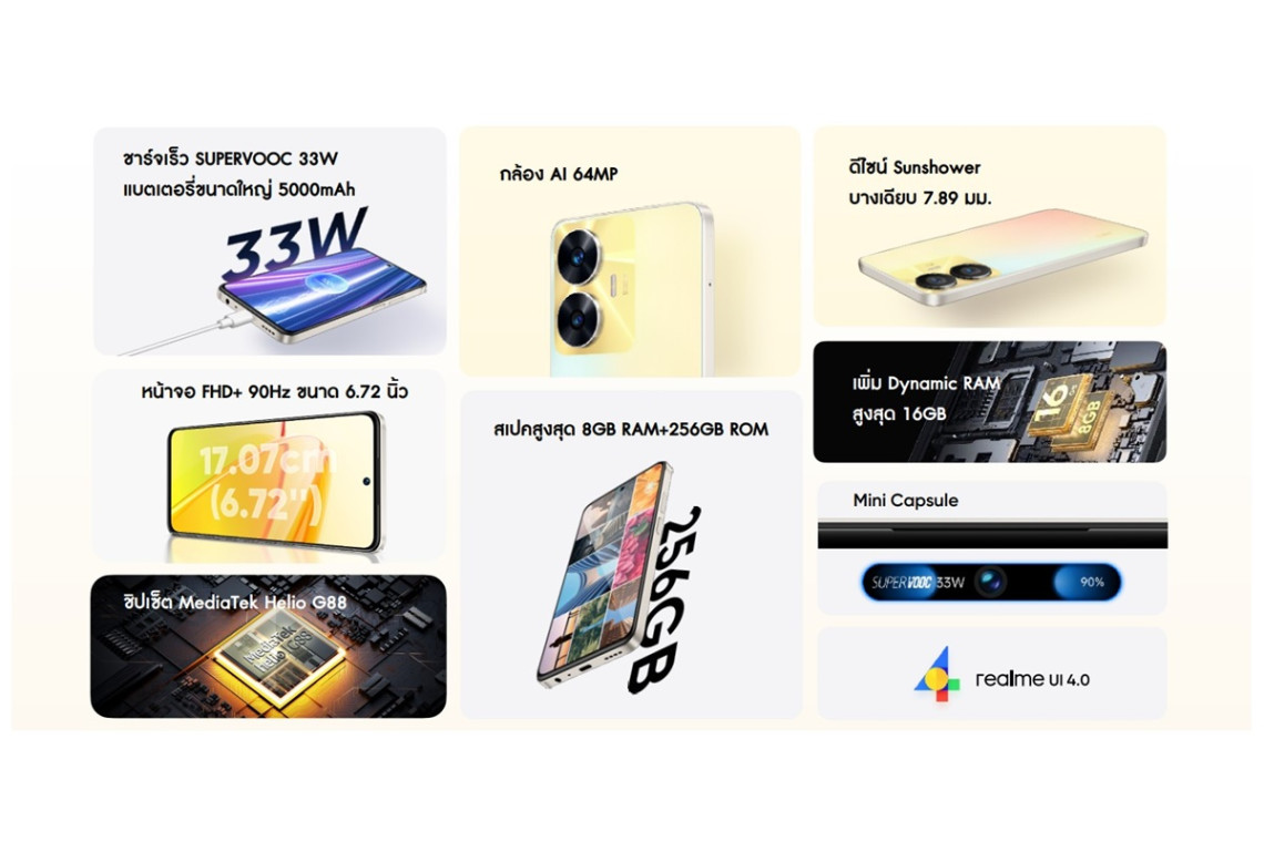 realme C55 ยังเป็น Android สมาร์ตโฟนรุ่นแรกที่มาพร้อมฟีเจอร์ “Mini Capsule” ลูกเล่นอันชาญ-ฉลาดในการแสดงผลหน้าจอครอบทับบริเวณที่เป็นเลนส์กล้องหน้า เพื่อการแสดงผลฟีเจอร์ต่าง ๆ ได้อย่างสร้างสรรค์และเพิ่มความสนุกสนานแก่ผู้ใช้งานมากยิ่งขึ้น ไม่ว่าจะเป็นการแจ้งเตือน บอกสถานะแบตเตอรี่ และฟังก์ชั่นการทำงานต่าง ๆ ได้อย่างรวดเร็ว