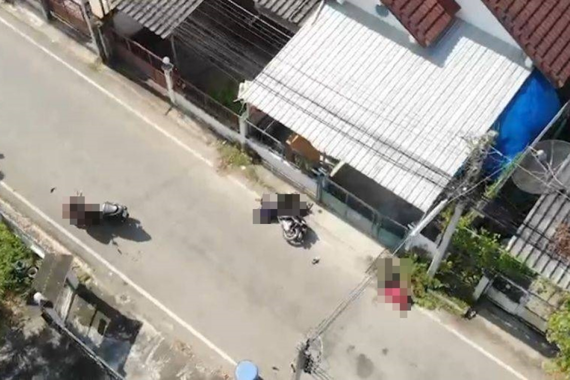 ส่วนที่ถูกยิงนอนบริเวรหน้าถนนคาดว่าน่าจะเสียชีวิต 1 รายทราบเป็นไรเดอร์แกรปขับรถส่งอาหาร