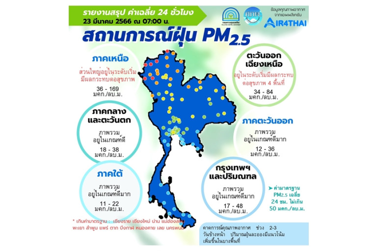 ศูนย์แก้ไขปัญหามลพิษทางอากาศ รายงานการติดตามตรวจสอบคุณภาพอากาศ ประจำวันที่ 23 มีนาคม 2566 ณ 07:00 น สรุปดังนี้ ภาพรวมปริมาณ PM2.5 ในประเทศพบเกินค่ามาตรฐานใน จ.เชียงราย จ.เชียงใหม่ จ.น่าน จ.แม่ฮ่องสอน จ.พะเยา จ.ลำพูน จ.แพร่ จ.ตาก จ.บึงกาฬ จ.หนองคาย จ.เลย และ จ. นครพนม