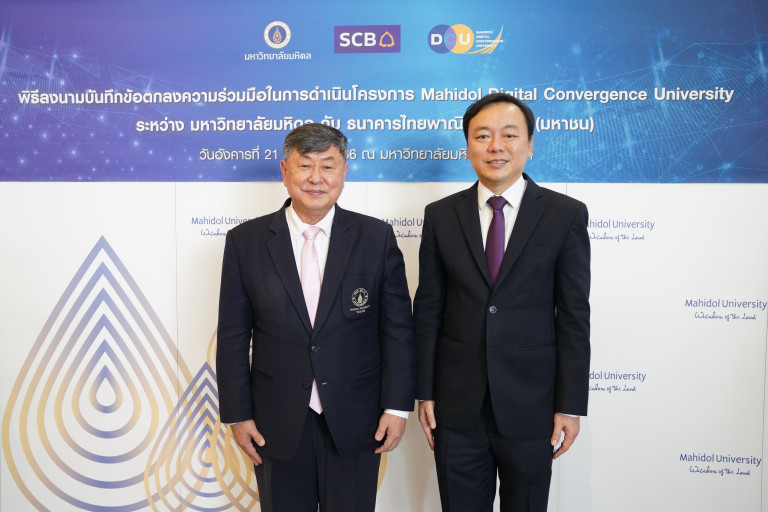 ดร.ยรรยง ไทยเจริญ รองผู้จัดการใหญ่อาวุโส ประธานเจ้าหน้าที่บริหาร กลุ่มธุรกิจ Wholesale และ รองผู้จัดการใหญ่อาวุโส ประธานเจ้าหน้าที่บริหาร กลุ่มธุรกิจ Wealth ธนาคารไทยพาณิชย์ ร่วมลงนามสานต่อความร่วมมือกับศาสตราจารย์ นายแพทย์บรรจง มไหสวริยะ อธิการบดีมหาวิทยาลัยมหิดล ขับเคลื่อนระบบนิเวศด้านดิจิทัลให้มหาวิทยาลัยมหิดลสู่การเป็นมหาวิทยาลัยต้นแบบแห่งดิจิทัลชั้นนำระดับโลก ภายใต้แนวคิด Mahidol Digital Convergence University (Mahidol DCU)