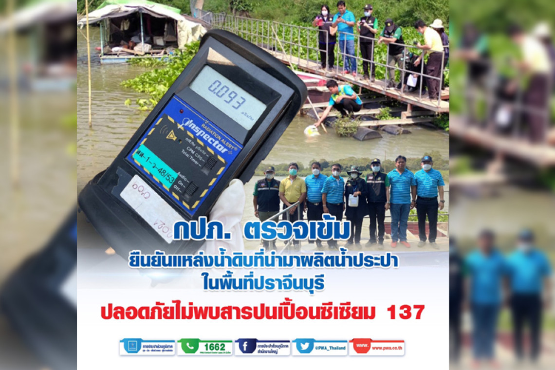 การประปาส่วนภูมิภาค (กปภ.) ตรวจสอบเข้ม ยืนยันแหล่งน้ำดิบที่นำมาผลิตน้ำประปาในพื้นที่สาขาปราจีนบุรี และสาขากบินทร์บุรี ปลอดภัยไม่พบสารปนเปื้อนซีเซียม 137 คุณภาพน้ำอยู่ในเกณฑ์มาตรฐานการผลิตน้ำประปาบริการประชาชน เพื่อใช้น้ำประปาในการอุปโภคบริโภคได้อย่างมั่นใจ