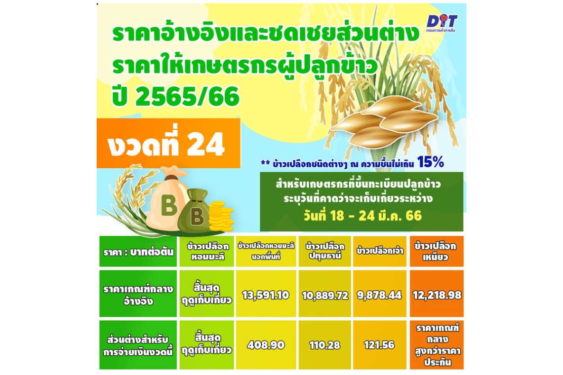 ประกันรายได้ข้าว งวดที่ 24 ราคาข้าวเปลือกยังทรง แต่เกษตรกรยังคงพอใจ คาดปีนี้ไทยส่งออกได้ทะลุ 8 ล้านตันนายอุดม ศรีสมทรง รองอธิบดีกรมการค้าภายใน เปิดเผยว่า คณะอนุกรรมการกำกับดูแลและกำหนดเกณฑ์กลางอ้างอิงโครงการประกันรายได้เกษตรกรผู้ปลูกข้าว ได้พิจารณาราคาเกณฑ์กลางอ้างอิงและการชดเชยส่วนต่างราคาตามโครงการประกันรายได้เกษตรกรผู้ปลูกข้าว ปี 2565/66 ซึ่งเป็นการดำเนินการตามนโยบายของรัฐมนตรีว่าการกระทรวงพาณิชย์ (นายจุรินทร์ ลักษณวิศิษฏ์) โดยสัปดาห์นี้เป็นการประกาศราคางวดที่ 24 สำหรับเกษตรกรที่แจ้งวันคาดว่าจะเก็บเกี่ยวระหว่างวันที่ 18 – 24 มีนาคม 2566 ปรากฏว่า ข้าวเปลือกหอมมะลินอกพื้นที่ มีราคาเกณฑ์กลางตันละ 13,591.10 บาท เกษตรกรจะได้รับชดเชยส่วนต่างตันละ 408.90 บาท ได้รับชดเชยสูงสุดครัวเรือนละ 6,542.40 บาท ข้าวเปลือกปทุมธานี มีราคาเกณฑ์กลางตันละ 10,889.72 บาท เกษตรกรจะได้รับชดเชยส่วนต่างตันละ 110.28 บาท ได้รับชดเชยสูงสุดครัวเรือนละ 2,757.00 บาท และข้าวเปลือกเจ้า มีราคาเกณฑ์กลางตันละ 9,878.44 บาท เกษตรกรจะได้รับชดเชยส่วนต่างตันละ 121.56 บาท ได้รับชดเชยสูงสุดครัวเรือนละ 3,646.80 บาท สำหรับข้าวเปลือกเหนียว มีราคาเกณฑ์กลางตันละ 12,218.98 บาท ซึ่งสูงกว่าราคาประกันที่ตันละ 12,000 บาท จึงไม่มีส่วนต่างชดเชยในงวดนี้ สำหรับข้าวเปลือกหอมมะลิไม่มีราคาเกณฑ์กลางอ้างอิง เนื่องจากสิ้นสุดฤดูเก็บเกี่ยวแล้ว โดยจะจ่ายเงินให้เกษตรกรที่ได้รับสิทธิ์งวดที่ 24 ในวันที่ 29 มีนาคม 2566
