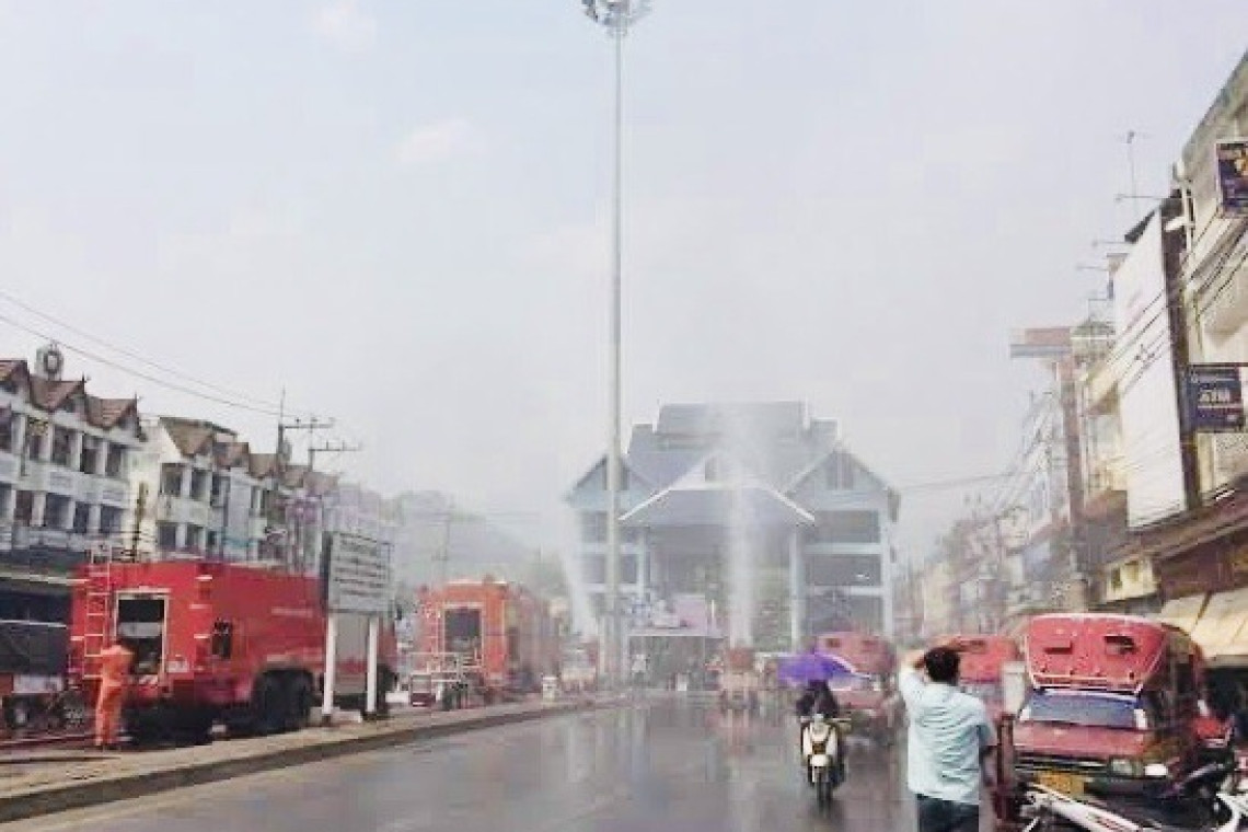 เมื่อวันที่ 24 มี.ค.2566 เทศบาลตำบลแม่สาย อ.แม่สาย จ.เชียงราย นำรถบรรทุกน้ำออกฉีดพ่นละอองน้ำและฉีดพ่นน้ำให้กับต้นไม้ตามเกาะกลาง ถนนตามชุมชนต่างๆ เพื่อสร้างความชุ่มชื้นในอากาศ เพื่อลดภาวะหมอกควันให้เบาบางลง ลดผลกระทบให้ประชาชนในพื้นที่ภายหลังจากที่ค่าฝุ่นละอองขนาดเล็กในอากาศ pm 2.5 เพิ่มขึ้นอย่างต่อเนื่อง โดยกรมควบคุมมลพิษตรวจวัดค่าที่จุดตรวจวัดแม่สายได้ถึง 326 ไมโครกรัมต่อลูกบาศก์เมตร ขณะที่พื้นที่ อ.เชียงของ วัดได้ 137 ไมโครกรัมต่อลูกบาศก์เมตร อ.เชียงแสน วัดได้ 272 ไมโครกรัมต่อลูกบาศก์เมตร ส่วน อ.เมืองเชียงราย วัดได้ 100 ไมโครกรัมต่อลูกบาศก์เมตร ซึ่งเป็นค่าที่มีผลกระทบกระทบต่อสุขภาพของประชาชน