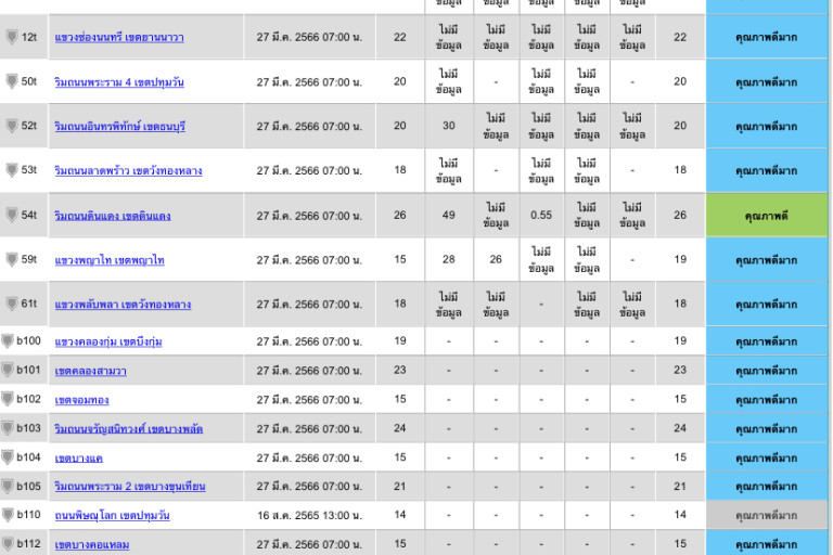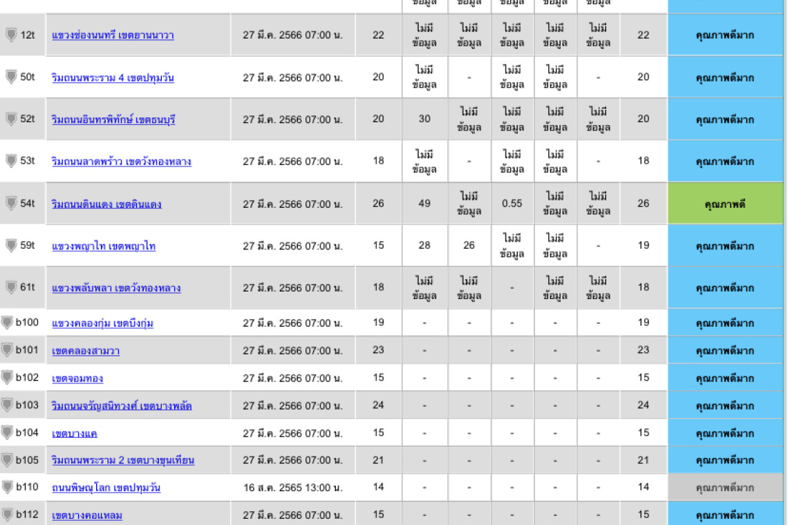 วันที่ 27 มีนาคม 2566 ระหว่างเวลา 05.00-06.00 น. กองจัดการคุณภาพอากาศและเสียง กรมควบคุมมลพิษรายงานสถานการณ์คุณภาพอากาศ พื้นที่กรุงเทพฯและปริมณฑล พบว่า คุณภาพอากาศอยู่ในระดับ คุณภาพดีมากถึงคุณภาพปานกลาง