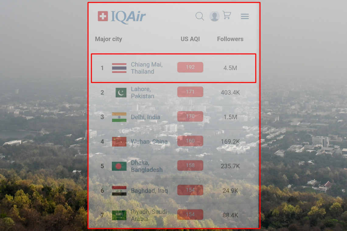 ในขณะที่ www.iqair.com ซึ่งรายงานคุณภาพอากาศและจัดอันดับเมืองมลพิษโลก โดยรายงานแบบเรียลไทม์ วันที่ 27 มี.ค.2566 เวลา 09.00 น.เชียงใหม่ ติดอันดับที่ 1 ของโลก โดยดัชนีคุณภาพอากาศอยู่ที่ 192 US AQI ซึ่งต่อเนื่องในช่วงวันหยุดสุดสัปดาห์นี้