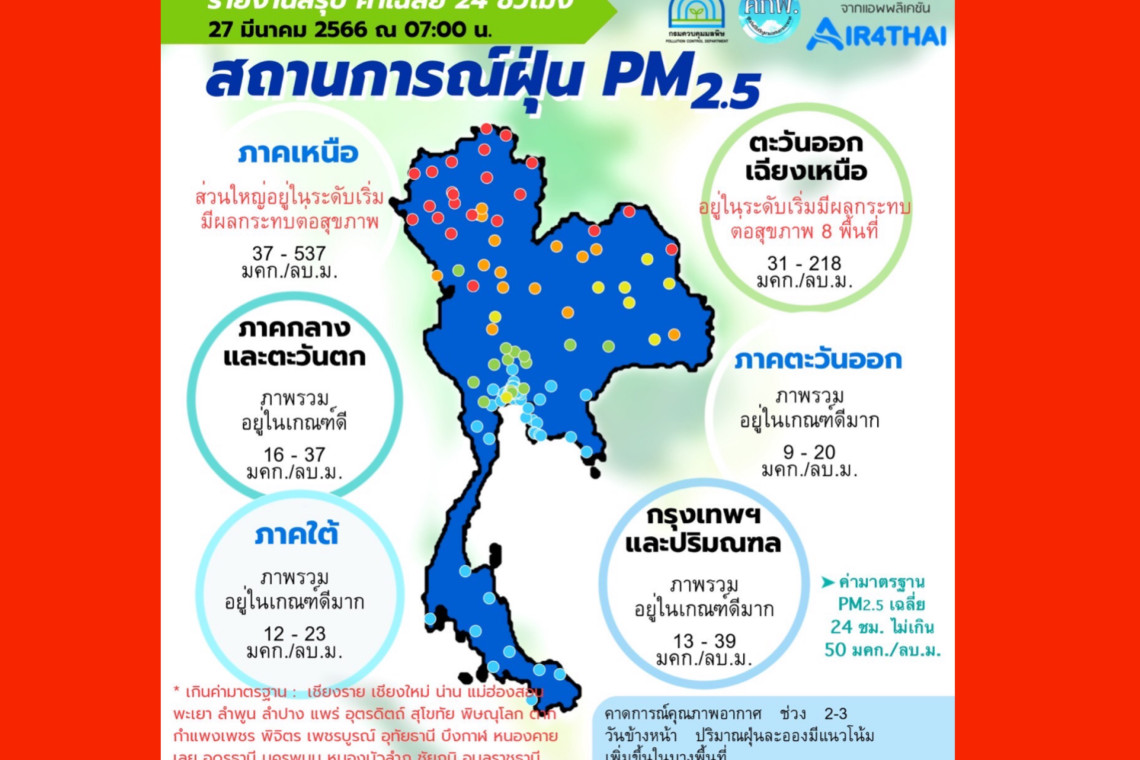 ศูนย์แก้ไขปัญหามลพิษทางอากาศ รายงานการติดตามตรวจสอบคุณภาพอากาศ ประจำวันที่ 27 มีนาคม 2566 ณ 07:00 น สรุปดังนี้ ภาพรวมปริมาณ PM2.5 ในประเทศพบเกินค่ามาตรฐานใน จ.เชียงราย จ.เชียงใหม่ จ.น่าน จ.แม่ฮ่องสอน จ.พะเยา จ.ลำพูน จ.ลำปาง จ.แพร่ จ.อุตรดิตถ์ จ.สุโขทัย จ.พิษณุโลก จ.ตาก จ.กำแพงเพชร จ.พิจิตร จ.เพชรบูรณ์ จ.อุทัยธานี จ.บึงกาฬ จ.หนองคาย จ.เลย จ.อุดรธานี จ.นครพนม จ.หนองบัวลำภู จ.ชัยภูมิ และ จ. อุบลราชธานี