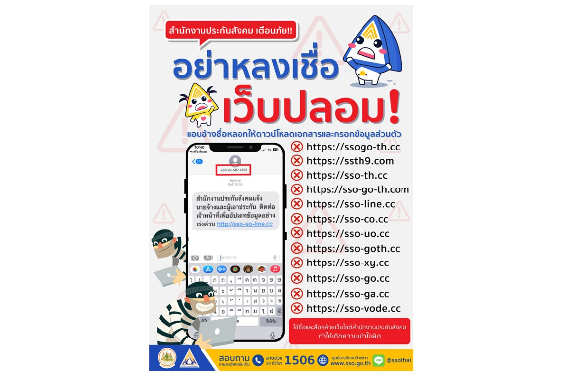 นายบุญสงค์ ทัพชัยยุทธ์ เลขาธิการสำนักงานประกันสังคม กระทรวงแรงงาน เปิดเผยถึงกรณีที่มีแก๊งมิจฉาชีพกำลังระบาดหนักในขณะนี้ โดยใช้วิธีการส่ง SMS พร้อมแนบลิงก์เว็บไซต์ปลอมที่กล่าวอ้างว่าเป็นเว็บไซต์ของสำนักงานประกันสังคม เมื่อเข้าสู่เว็บไซต์ดังกล่าว จะแนะนำให้ผู้ใช้งานดาวน์โหลดแอปพลิเคชัน ซึ่งหากมีผู้หลงเชื่อดาวน์โหลดและติดตั้งลงในโทรศัพท์มือถือ ท่านจะถูกขโมยข้อมูลส่วนบุคคล เช่น ชื่อ นามสกุล เลขประจำตัวประชาชน หมายเลขโทรศัพท์ รหัสผ่านในการทำธุรกรรมทางการเงิน เป็นเหตุให้สูญเสียเงินในบัญชี อีกทั้งยังสามารถนำข้อมูลเหล่านี้ไปก่ออาชญากรรมอื่นๆได้ จึงขอแจ้งเตือนให้ผู้ประกันตนโปรดระมัดระวังอย่าหลงเชื่อเป็นอันขาด นอกจากนี้ สำนักงานประกันสังคมได้ดำเนินการเฝ้าระวังและติดตามอย่างต่อเนื่อง โดยตรวจพบเว็บไซต์ปลอมเพิ่มเติม จึงได้ประสานงานแจ้งผู้ให้บริการเพื่อปิดเว็บไซต์ปลอมแล้ว ดังนี้