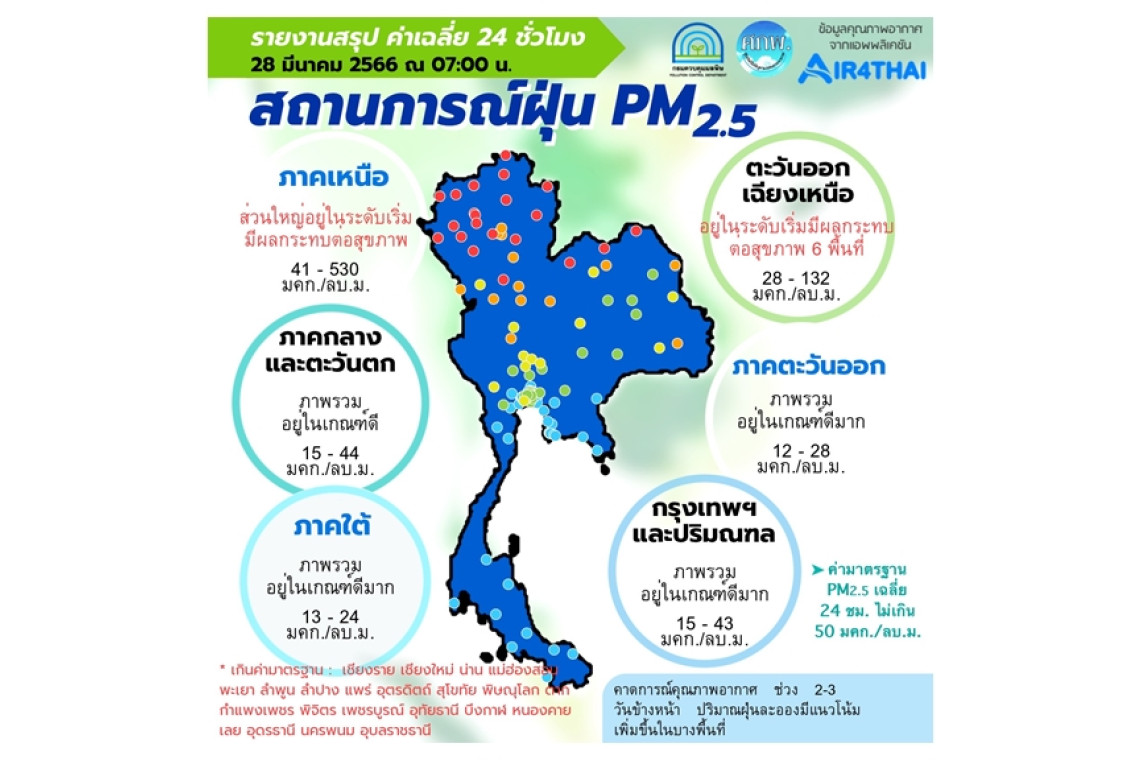 ภาพรวมปริมาณ PM2.5 ในประเทศพบเกินค่ามาตรฐานใน จ.เชียงราย จ.เชียงใหม่ จ.น่าน จ.แม่ฮ่องสอน จ.พะเยา จ.ลำพูน จ.ลำปาง จ.แพร่ จ.อุตรดิตถ์ จ.สุโขทัย จ.พิษณุโลก จ.ตาก จ.กำแพงเพชร จ.พิจิตร จ.เพชรบูรณ์ จ.อุทัยธานี จ.บึงกาฬ จ.หนองคาย จ.เลย จ.อุดรธานี จ.นครพนม และ จ. อุบลราชธานี