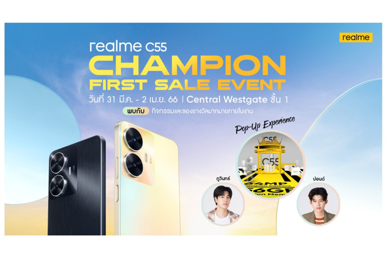 realme (เรียลมี) ชวนคุณมาสัมผัสตัวจริงเสียงจริงของแชมป์เปี้ยนสมาร์ตโฟนกับ realme C55 ประกาศการวางจำหน่ายใน Brand shop ทุกสาขา และศูนย์ตัวแทนจำหน่ายทั่วประเทศ ตั้งแต่วันที่ 31 มีนาคม เป็นต้นไป พร้อมเตรียมจัดกิจกรรมชูความเป็นแชมป์เปี้ยน “realme C55 Champion First Sale Event” ต้อนรับการเปิดจำหน่ายในวันที่ 31 มีนาคม - 2 เมษายน 2566 ณ บริเวณ ลานโปร F ชั้น 1 หน้าห้าง Central ศูนย์การค้าเซ็นทรัลเวสต์เกต ผู้เข้าร่วมงานจะได้เต็มอิ่มกับกิจกรรมและเกมต่าง ๆ มากมาย และเพื่อให้สมศักดิ์ศรีแชมป์เปี้ยนสมาร์ตโฟน เรียลมีจึงยกขบวนความพิเศษมามอบให้แฟน ๆ มากกว่าเดิม ด้วยแขกรับเชิญพิเศษและ KOL ชื่อดังที่จะมาร่วมสร้างสีสันให้คุณมาเที่ยวชมงานได้ทุกวันแบบไม่มีเบื่อ และไฮไลต์ที่พลาดไม่ได้ เมื่อเรียลมีเอาใจแฟน ๆ ซีรี่ส์วาย “เพื่อนายแค่หนึ่งเดียว (Never Let Me Go)” มากรี๊ดกันให้สนั่นฮอลล์กับงาน Fan Meet สุดฟินที่นำคู่จิ้น “ปอนด์-ณราวิชญ์ เลิศรัตน์โกสุมภ์” และ “ภูวิน-ภูวินทร์ ตั้งศักดิ์ยืน” มากระทบไหล่และร่วมทำกิจกรรมกับแฟนคลับอย่างใกล้ชิดในวันที่ 1 เมษายน นอกจากนี้ ยังมีกิจกรรมสุดพิเศษปิดท้ายงานในวันที่ 2 เมษายนอย่างสุดสนุก แอบกระซิบเลยว่าใครไปเข้าร่วมงาน อาจได้ลุ้นของรางวัลพรีเมียมกลับบ้านกันไปแบบฟรี ๆ!