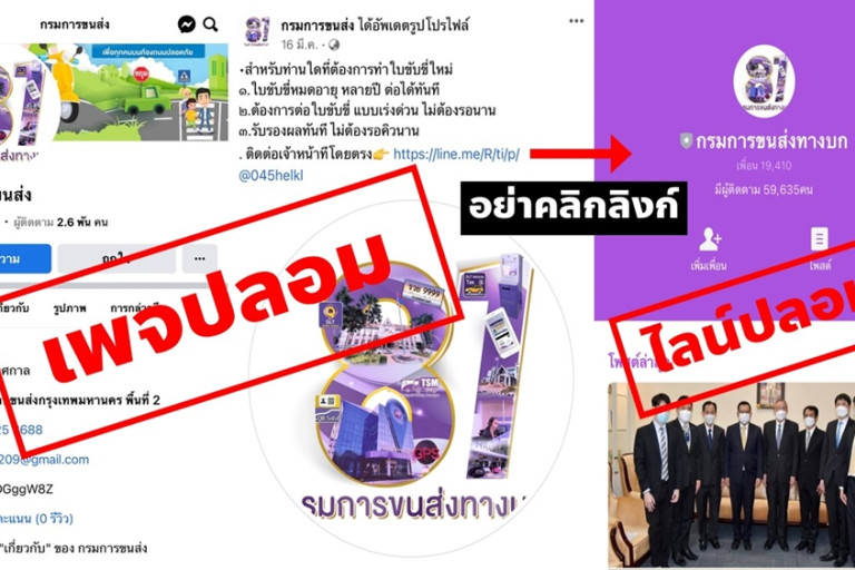 ที่ผ่านมาจากการตรวจสอบและวิเคราะห์ข้อมูลจากระบบการรับแจ้งความออนไลน์ พบว่ามีผู้เสียหายจำนวนหลายรายถูกมิจฉาชีพแอบอ้างเป็นเจ้าหน้าที่กรมการขนส่งทางบก หลอกลวงให้โอนเงินเพื่อเป็นค่าทำใบอนุญาตขับขี่ใหม่ และค่าต่ออายุใบอนุญาตขับขี่ที่สิ้นสุดการอนุญาตแล้ว ผ่านทางเพจเฟซบุ๊ก และไลน์ที่มิจฉาชีพสร้างปลอมขึ้นมาเพื่อให้คล้ายคลึงกับเพจเฟซบุ๊ก และไลน์ของกรมการขนส่งทางบกจริง โดยเพจปลอมดังกล่าวใช้บัญชีชื่อว่า “กรมการขนส่ง” ภายในเพจได้ใช้รูปภาพ และตราสัญลักษณ์ของกรมการขนส่งทางบก นำรูปภาพ และคัดลอกเนื้อหาจากเพจกรมการขนส่งทางบกจริงมาใช้หลอกลวงประชาชน โดยมีการประกาศเชิญชวนให้ประชาชนทั่วไปแอดไลน์ปลอมติดต่อกับเจ้าหน้าที่โดยตรง อ้างว่าสามารถต่ออายุใบอนุญาตขับขี่ได้ทันที ไม่ต้องรอคิวนาน นอกจากนี้ยังตั้งรูปภาพโปรไฟล์เป็นรูปของผู้บริหารกรมการขนส่งทางบก เพื่อสร้างความน่าเชื่อถืออีกด้วย กระทั่งเมื่อผู้เสียหายหลงเชื่อติดต่อไปทางไลน์กรมการขนส่งปลอมแล้ว มิจฉาชีพจะให้ส่งข้อมูลส่วนตัวที่สำคัญ เช่น ภาพถ่ายบัตรประชาชน หมายเลขโทรศัพท์ รูปถ่าย และหลอกให้ชำระค่าบริการ ทำให้ได้รับความเสียหายเป็นจำนวนมาก