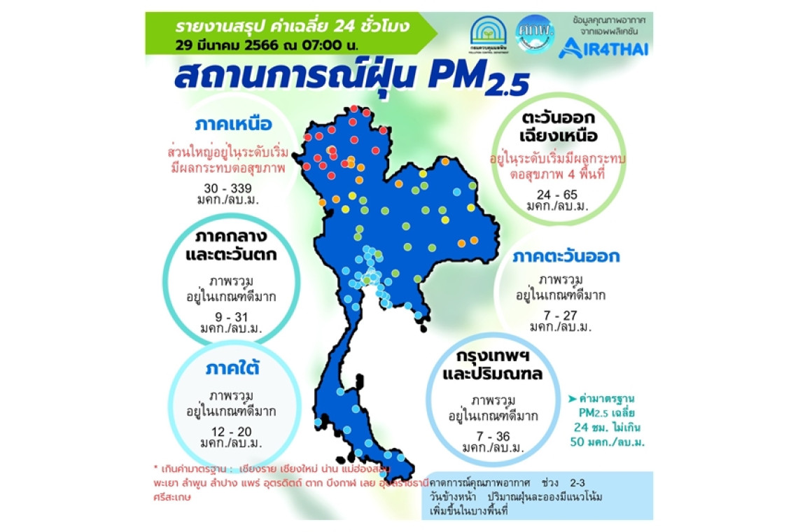 ศูนย์แก้ไขปัญหามลพิษทางอากาศ รายงานการติดตามตรวจสอบคุณภาพอากาศ ประจำวันที่ 29 มีนาคม 2566 ณ 07:00 น สรุปดังนี้ ภาพรวมปริมาณ PM2.5 ในประเทศพบเกินค่ามาตรฐานใน จ.เชียงราย จ.เชียงใหม่ จ.น่าน จ.แม่ฮ่องสอน จ.พะเยา จ.ลำพูน จ.ลำปาง จ.แพร่ จ.อุตรดิตถ์ จ.ตาก จ.บึงกาฬ จ.เลย จ.อุบลราชธานี และ จ. ศรีสะเกษ